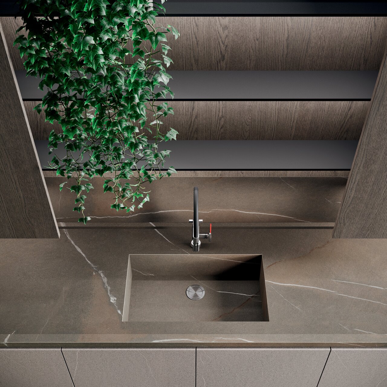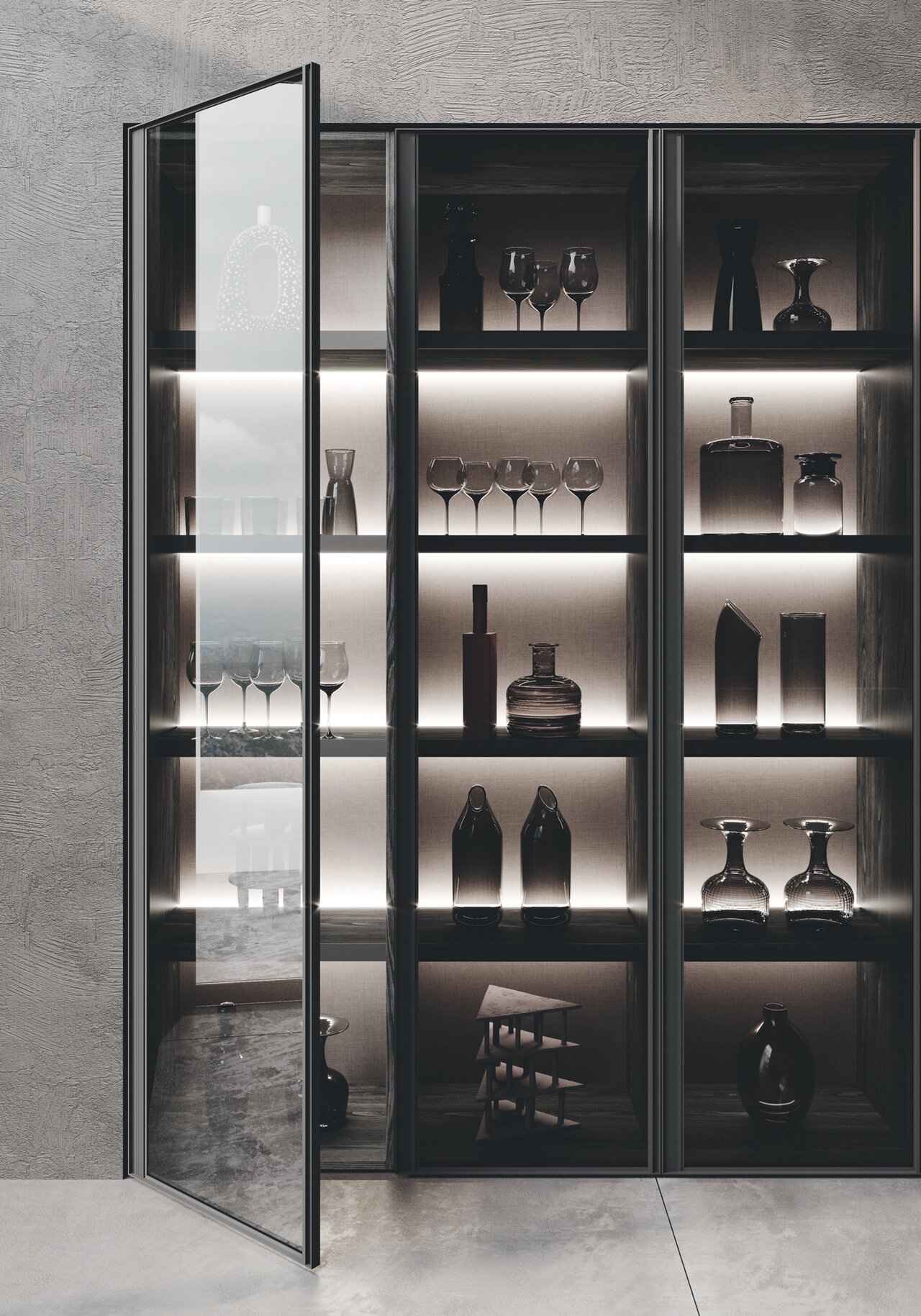 An environment that connects the spaces of the house, eliminating the separation between the kitchen and living areas. Thanks to the use of pillar columns, vertical containing and functional elements, each room is developed into delimited but open areas, similar to theatrical spaces, with a wide scope.