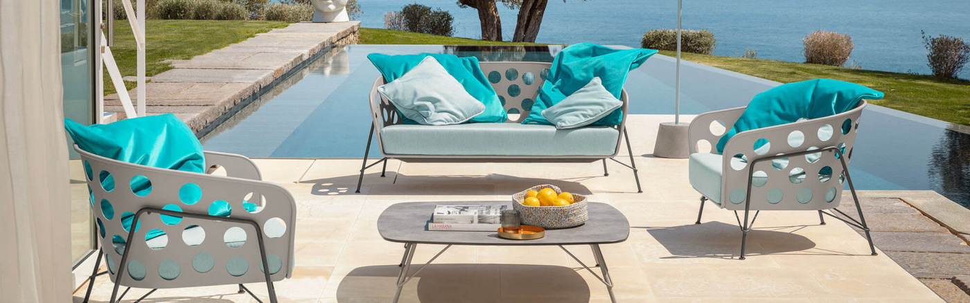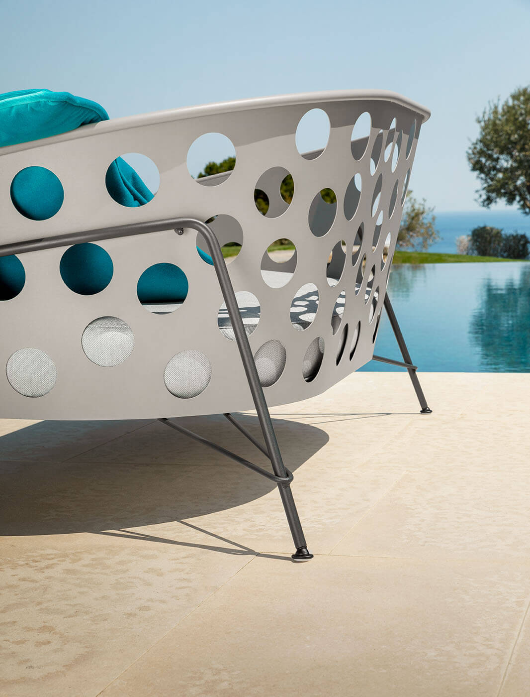 Two-seats sofa with four legs base, structure and backrest in lacquered metal.