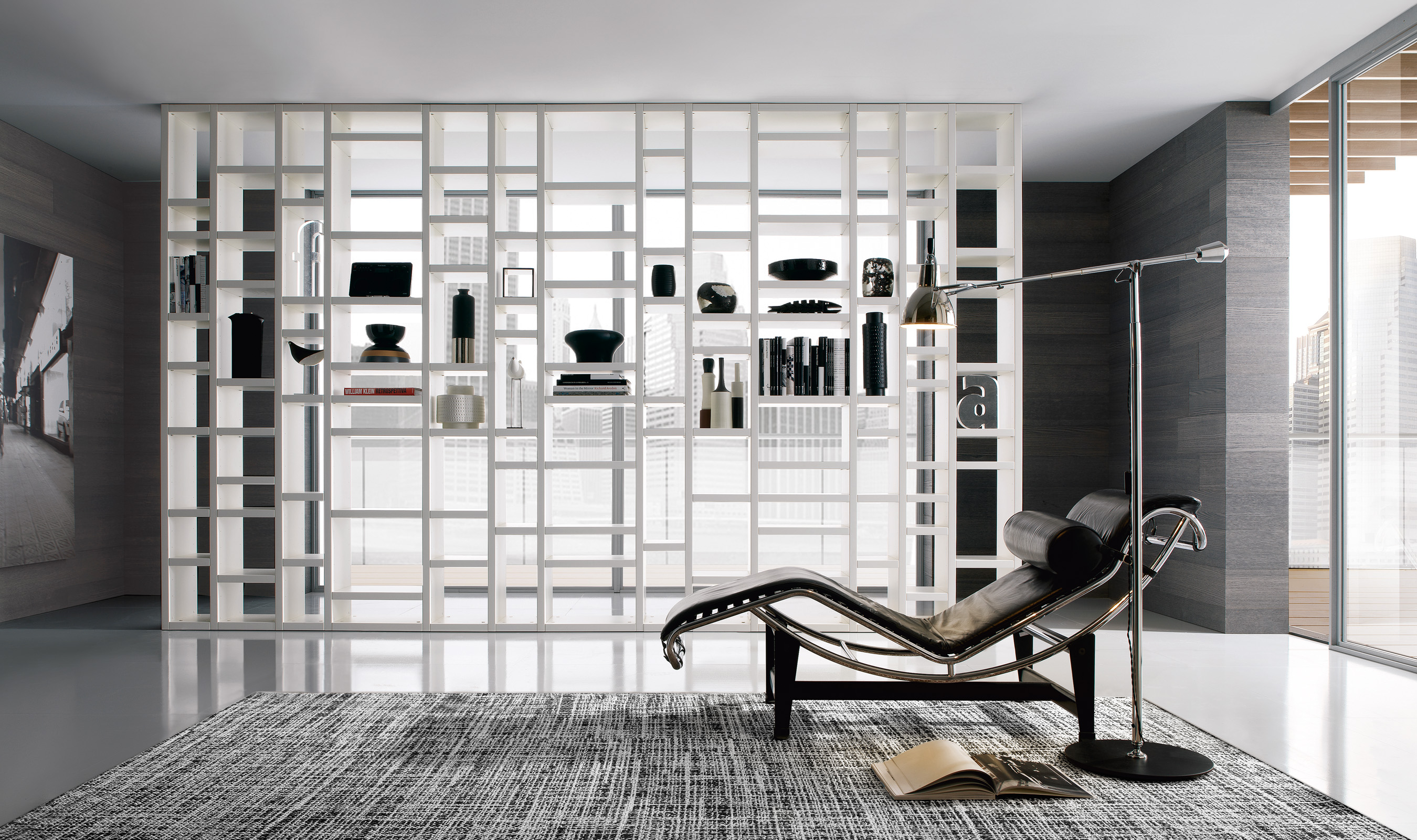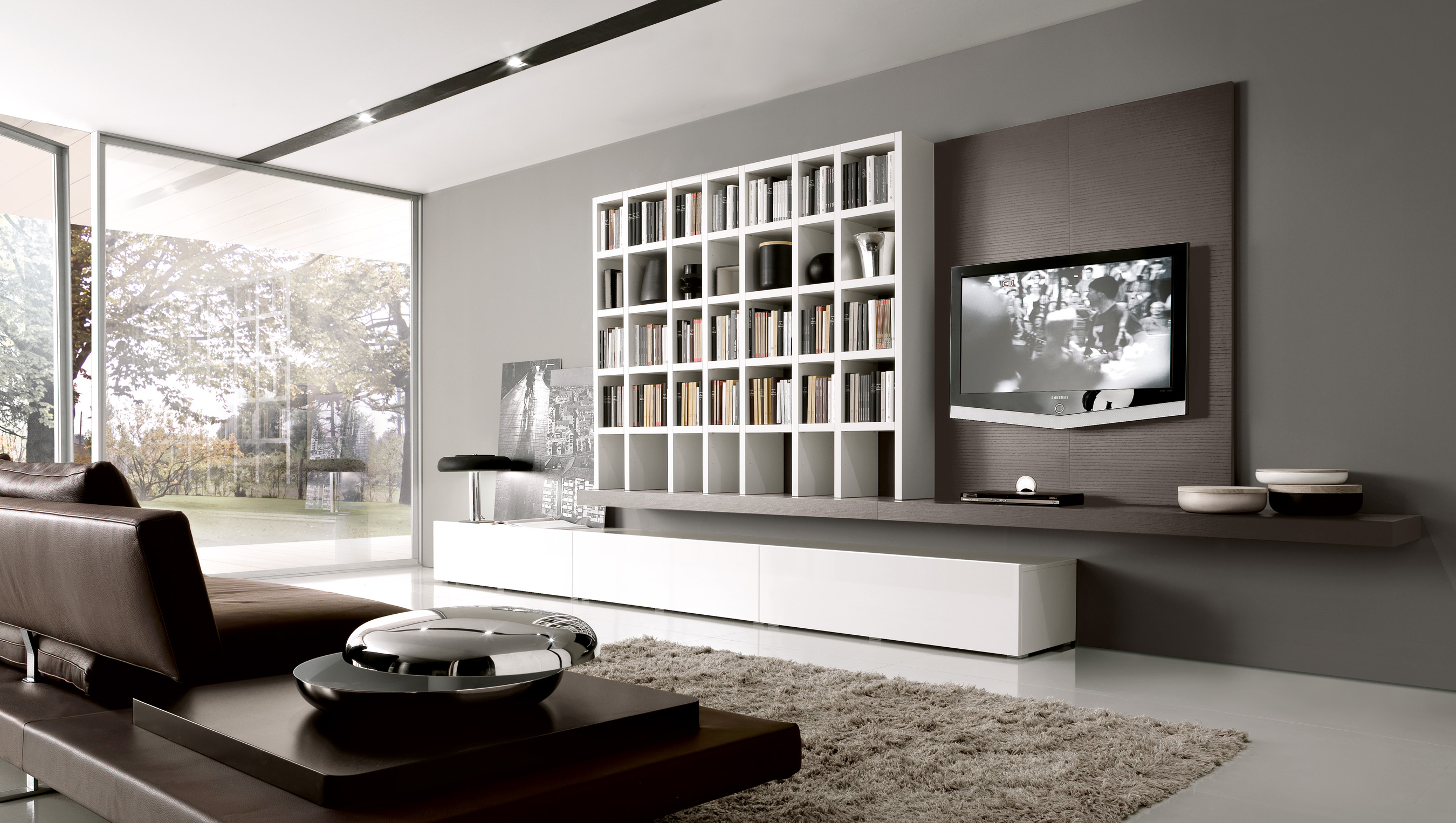 The compartments contain a special LED lighting system. Finishes: matte lacquer, glossy colours, natural wood, veneer/facing.