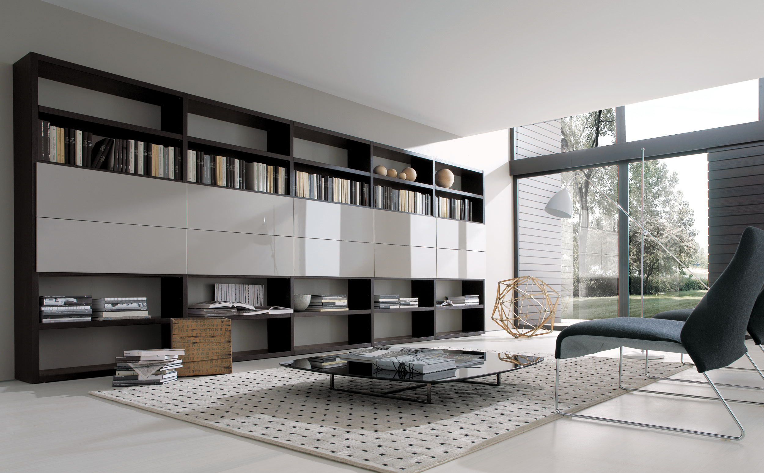 The program offers a series of modules of different types and sizes, hanging cabinets with flap, leaf or sliding doors, and drawers in a range of sizes.