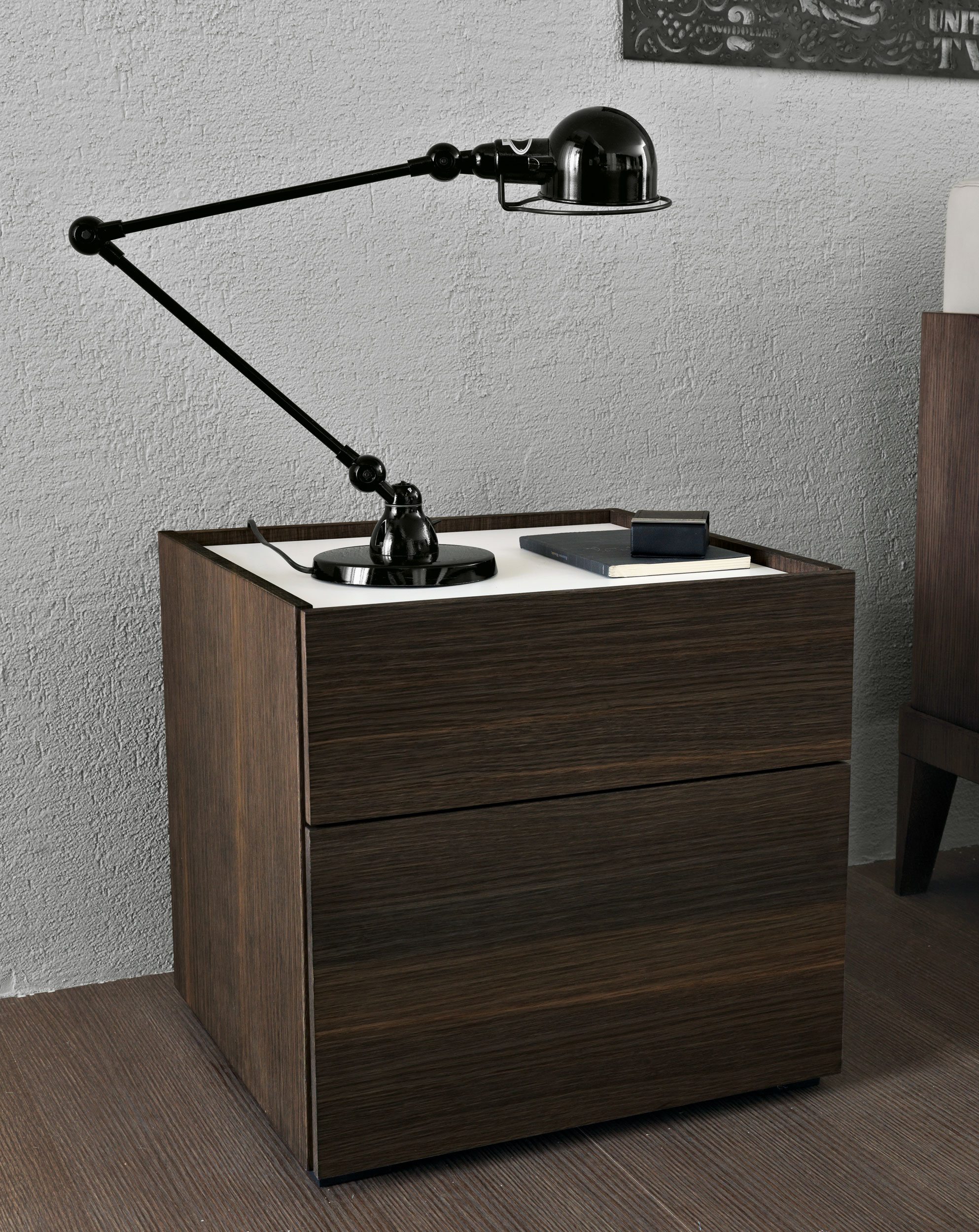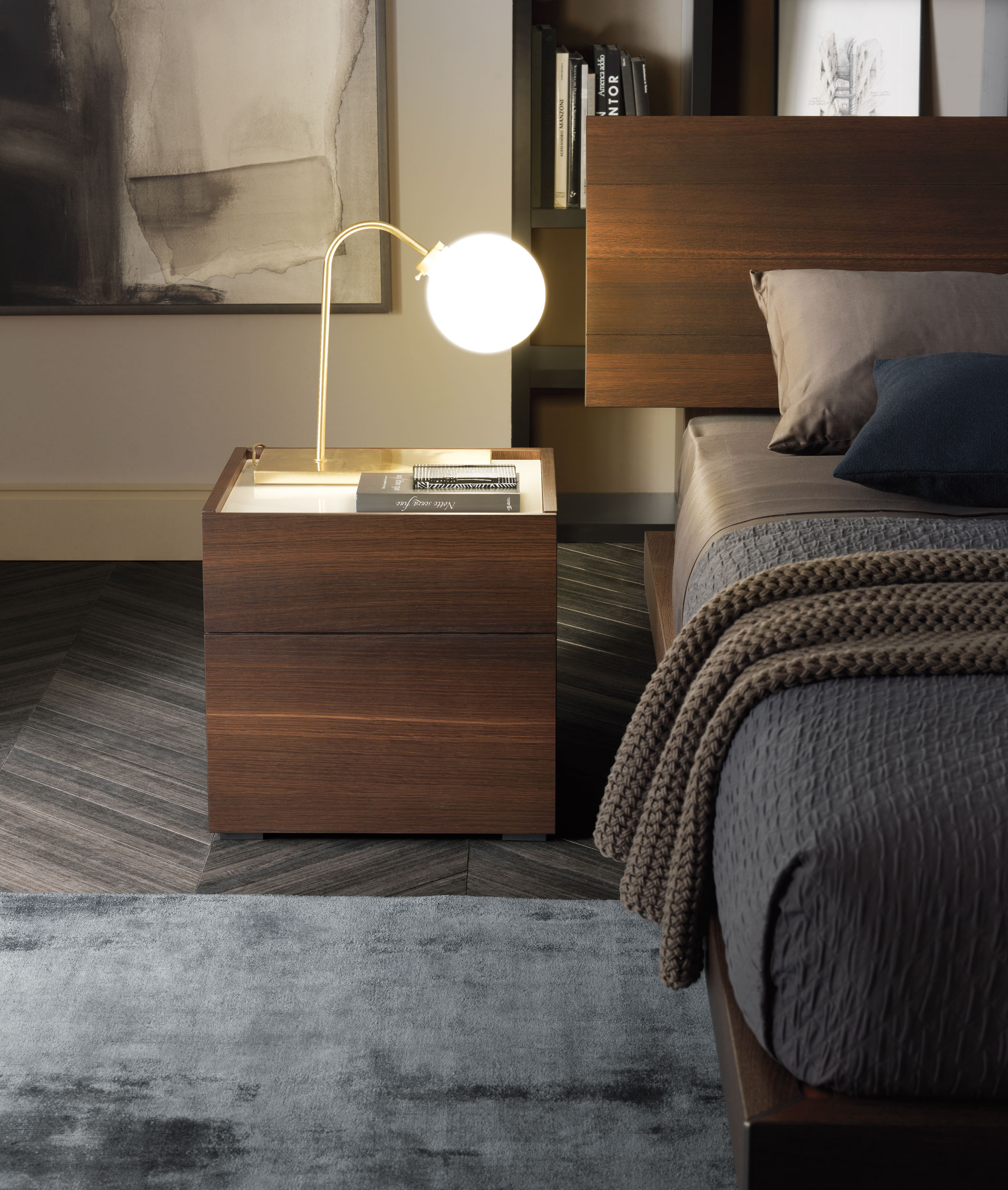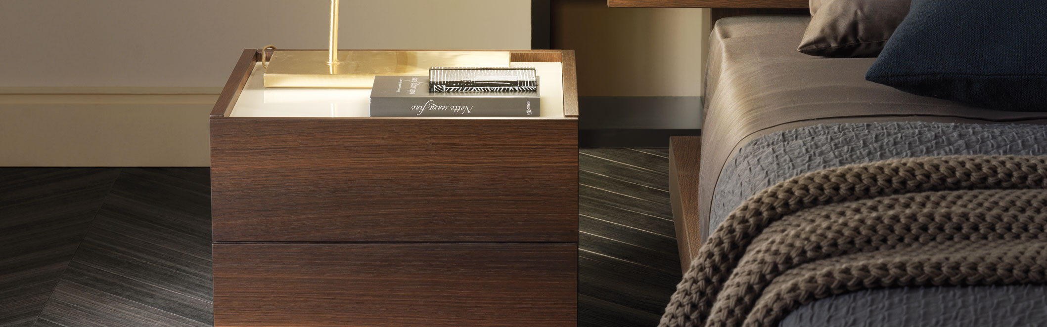 Various chest of drawers and bedside units Cube that intelligently combines wood, lacquer and glass.