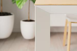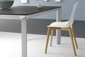 The table's top adopts the "Glue Point" system, which bonds a 6mm thick tempered glass, tempered glass with visible ceramic effect, laminated, or veneered surface onto a 12mm sub-panel. This solution provides a smooth, durable, and versatile surface that suits various settings.