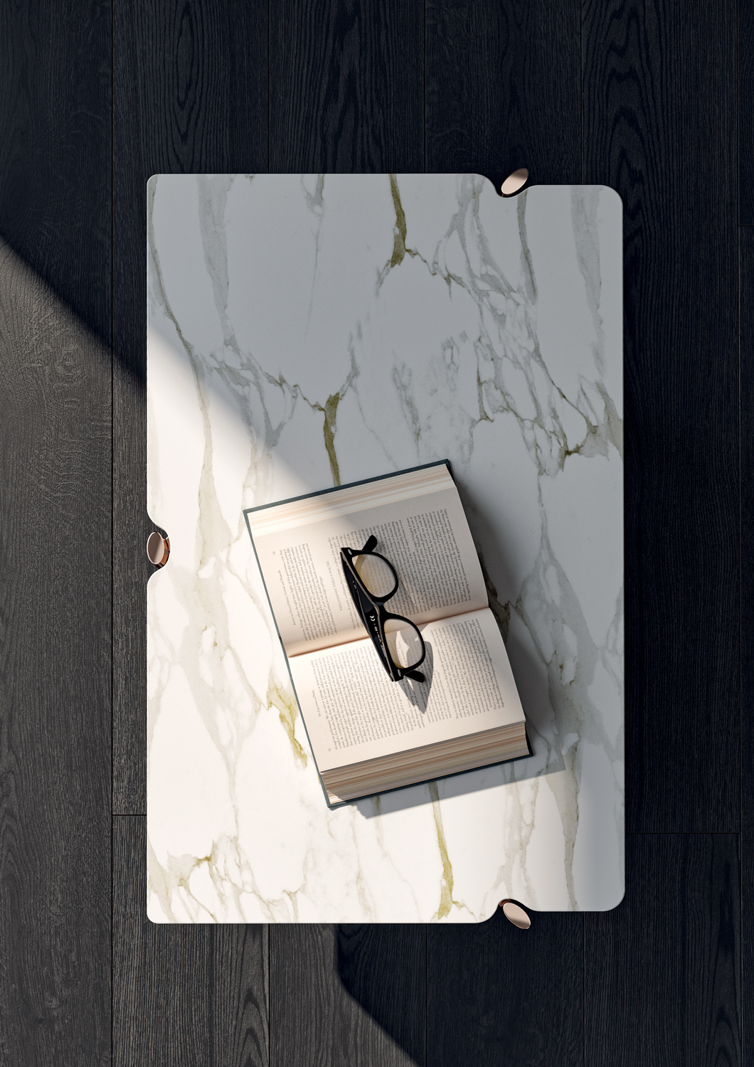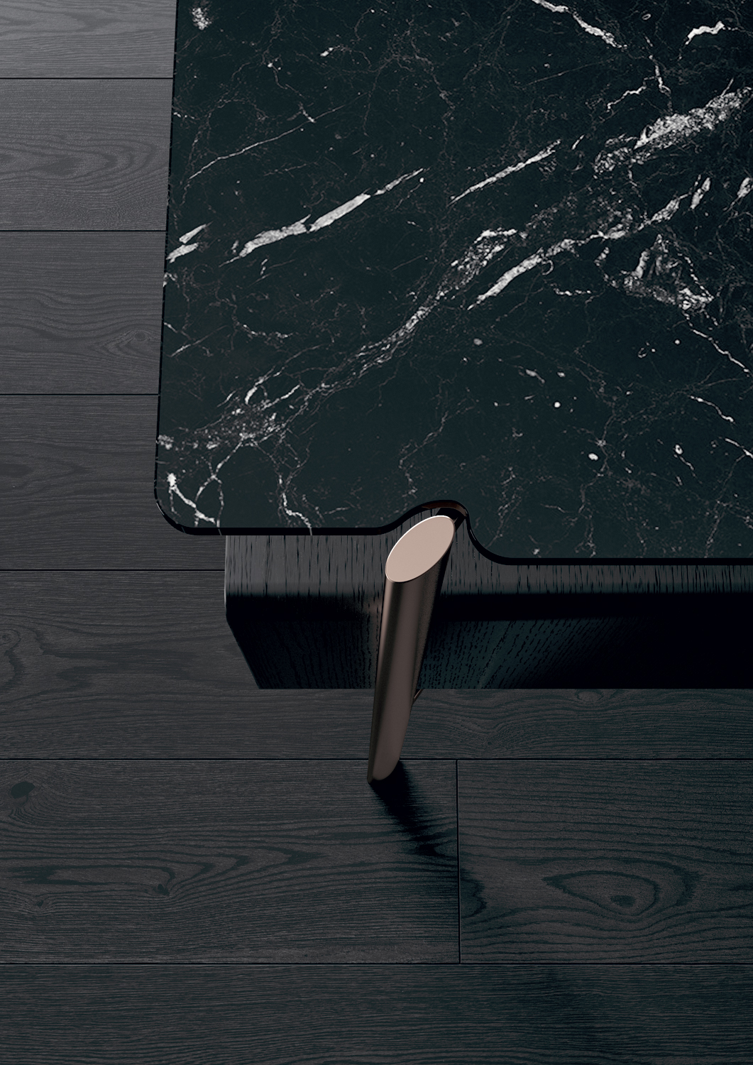 The Eros night group, consisting of a chest of drawers and bedside table, is characterized by the sophisticated dialogue between the different materials that compose it: metal, marble, wood.