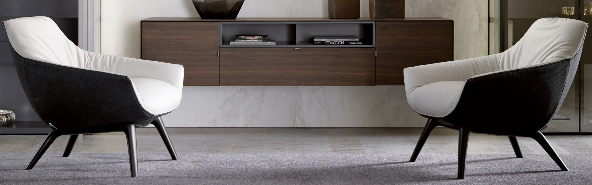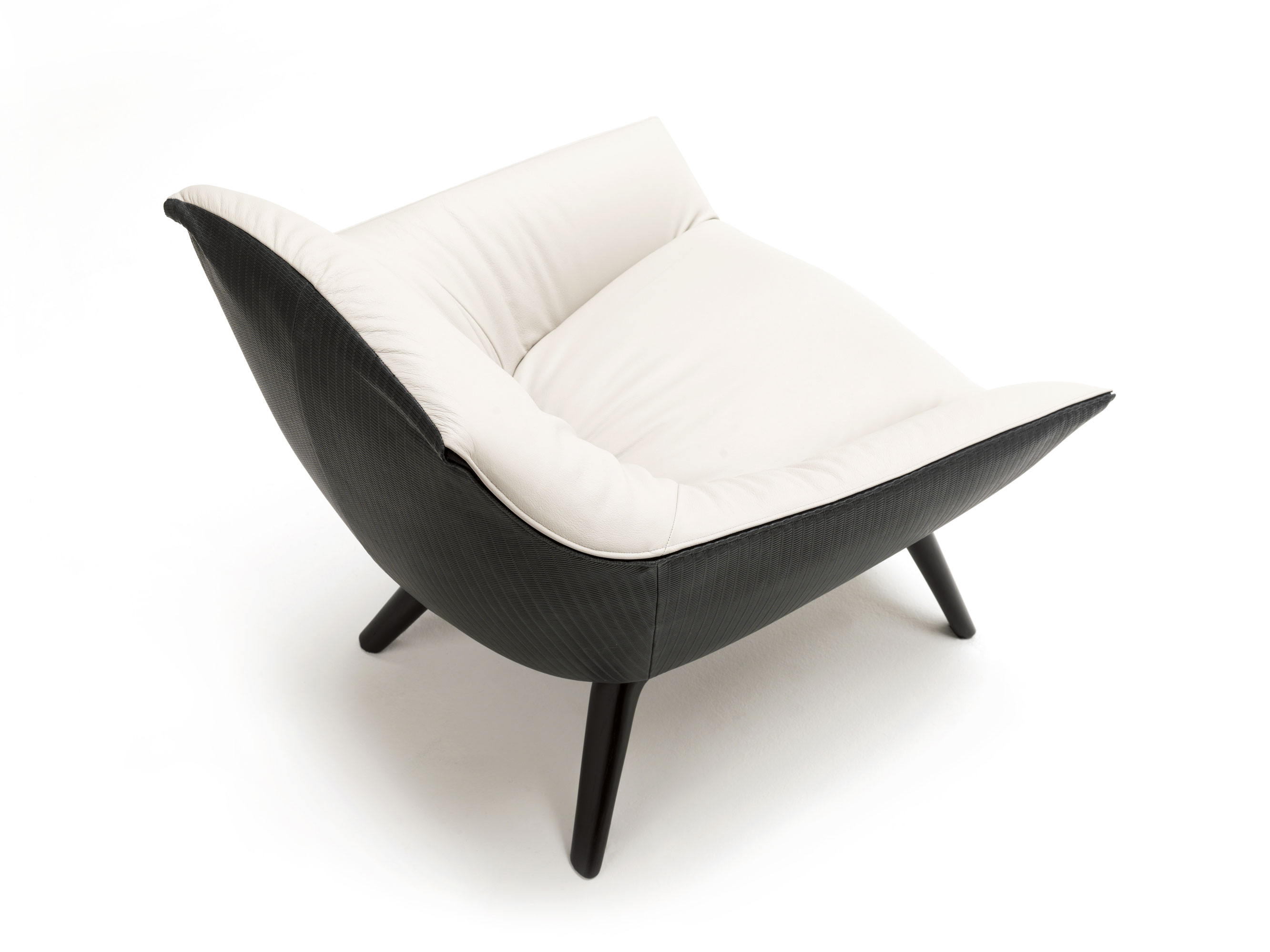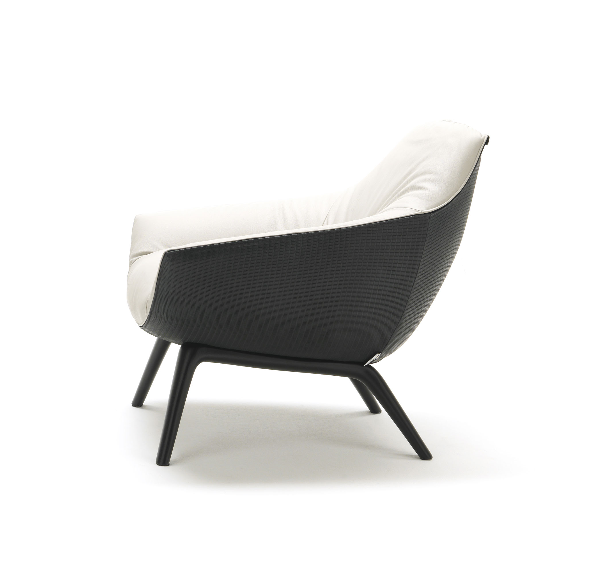 The base of the Florentia armchair enlivens the juxtaposition of the rigorously designed legs with the wraparound structure of the frame.