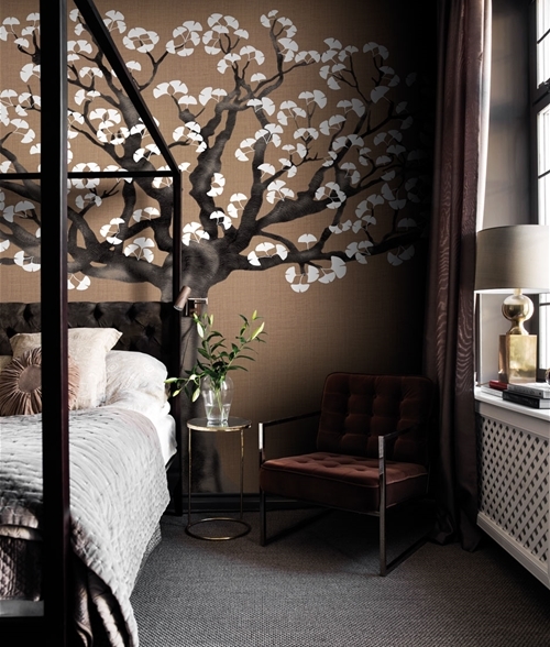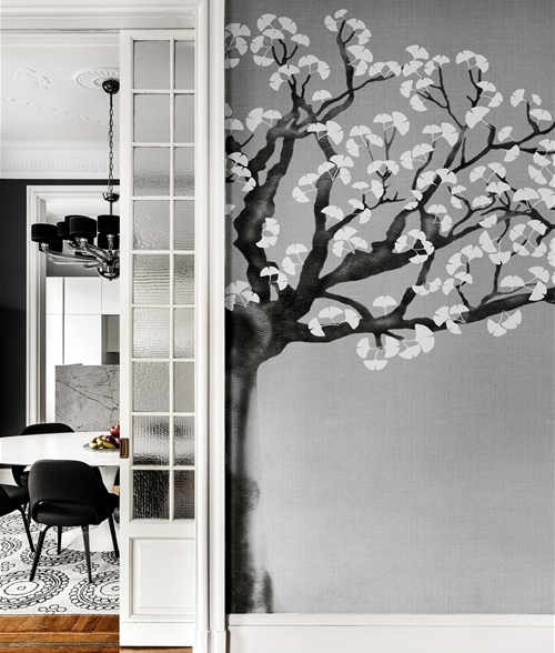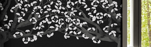 Two ginkgo trees with white leaves are reflected in this wallpaper.