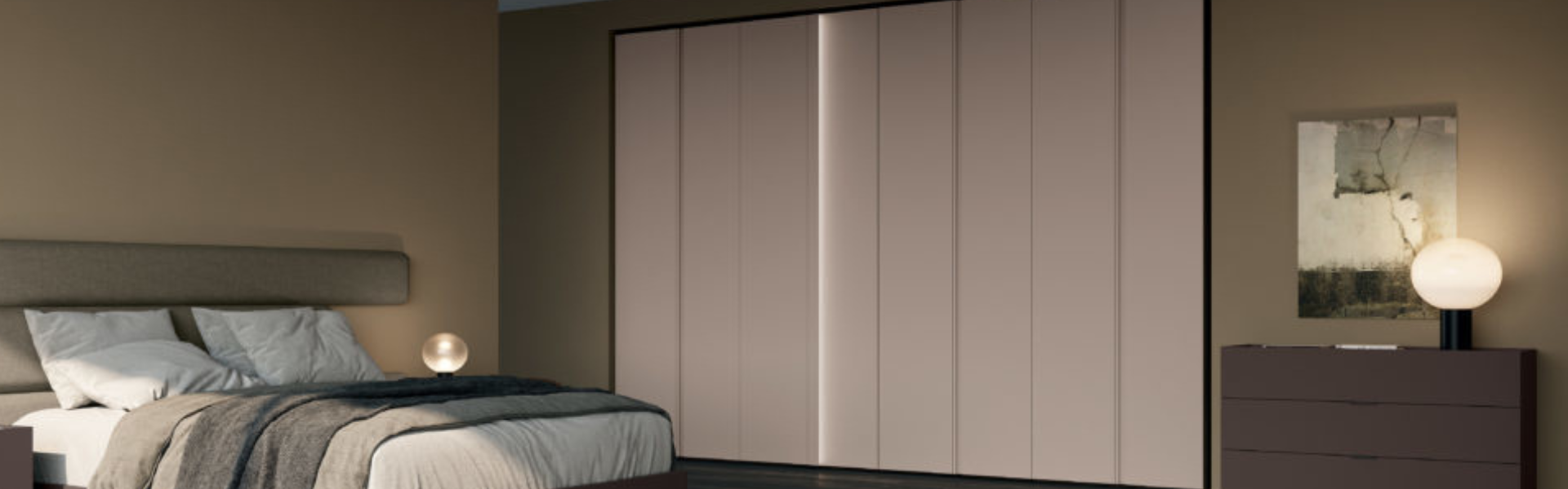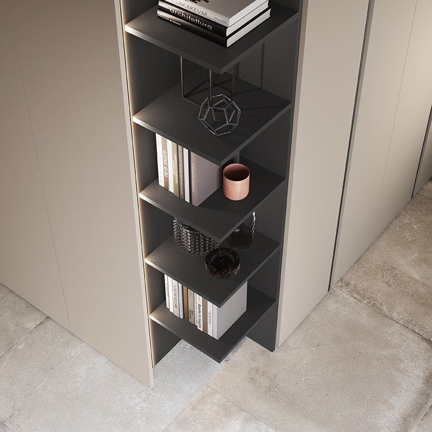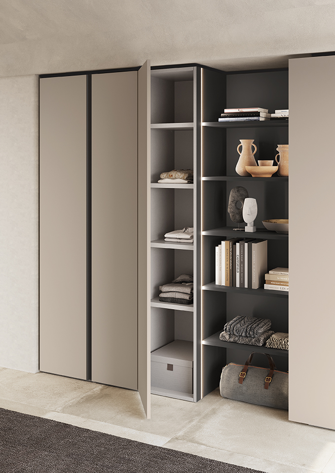 The LEWITT PLUS swing wardrobe and COVER module with integrated lighting in melamine-faced Canapa and matt lacquered Grigio fango complement each other perfectly.