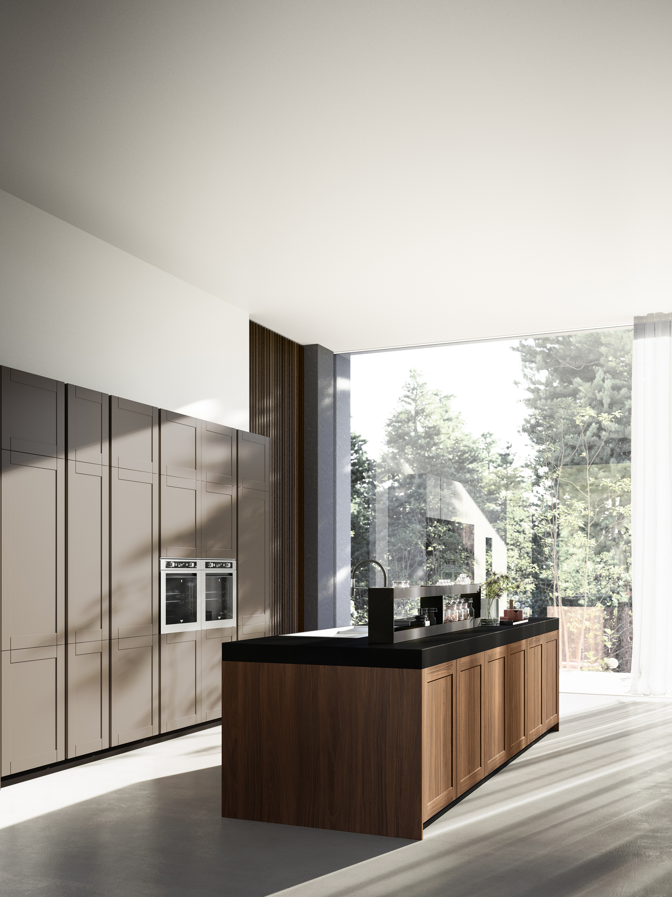 Suggestions and memories accompany the full livability of the spaces, interpreted by the door frame in solid wood Walnut island and the door frame in mdf matt lacquered Metro columns. The rigorous and essential design is emphasized by the push-pull opening of the doors and the thick Silestone worktop.