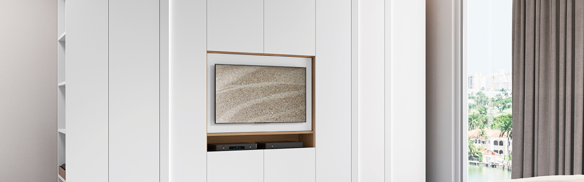 The openable and swivel TV compartment includes a housing for electronic devices and cable routing.