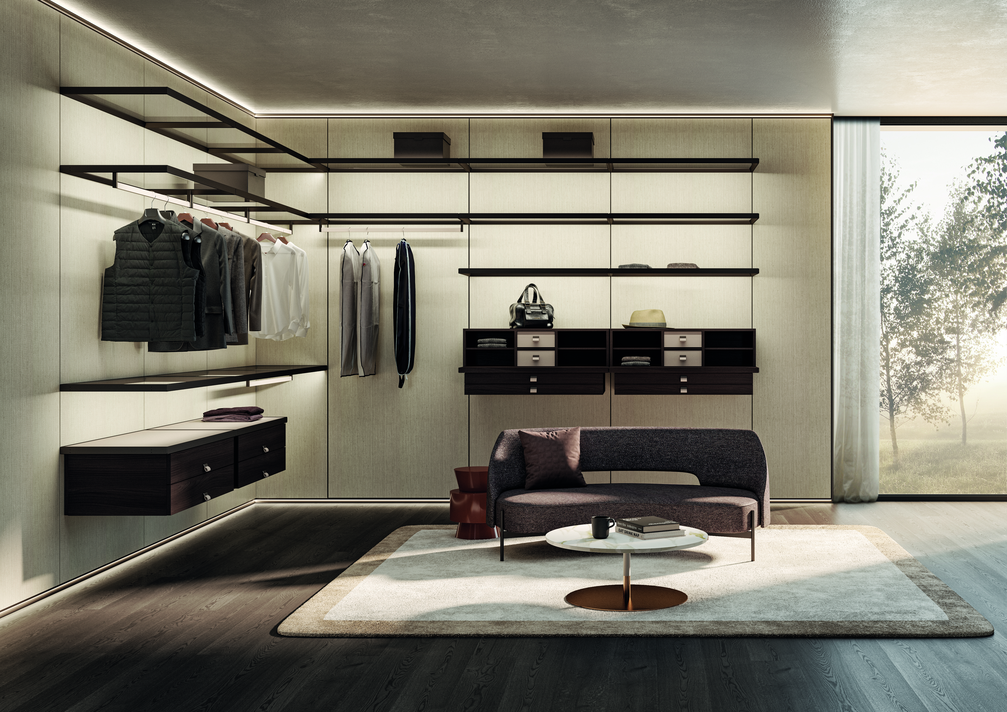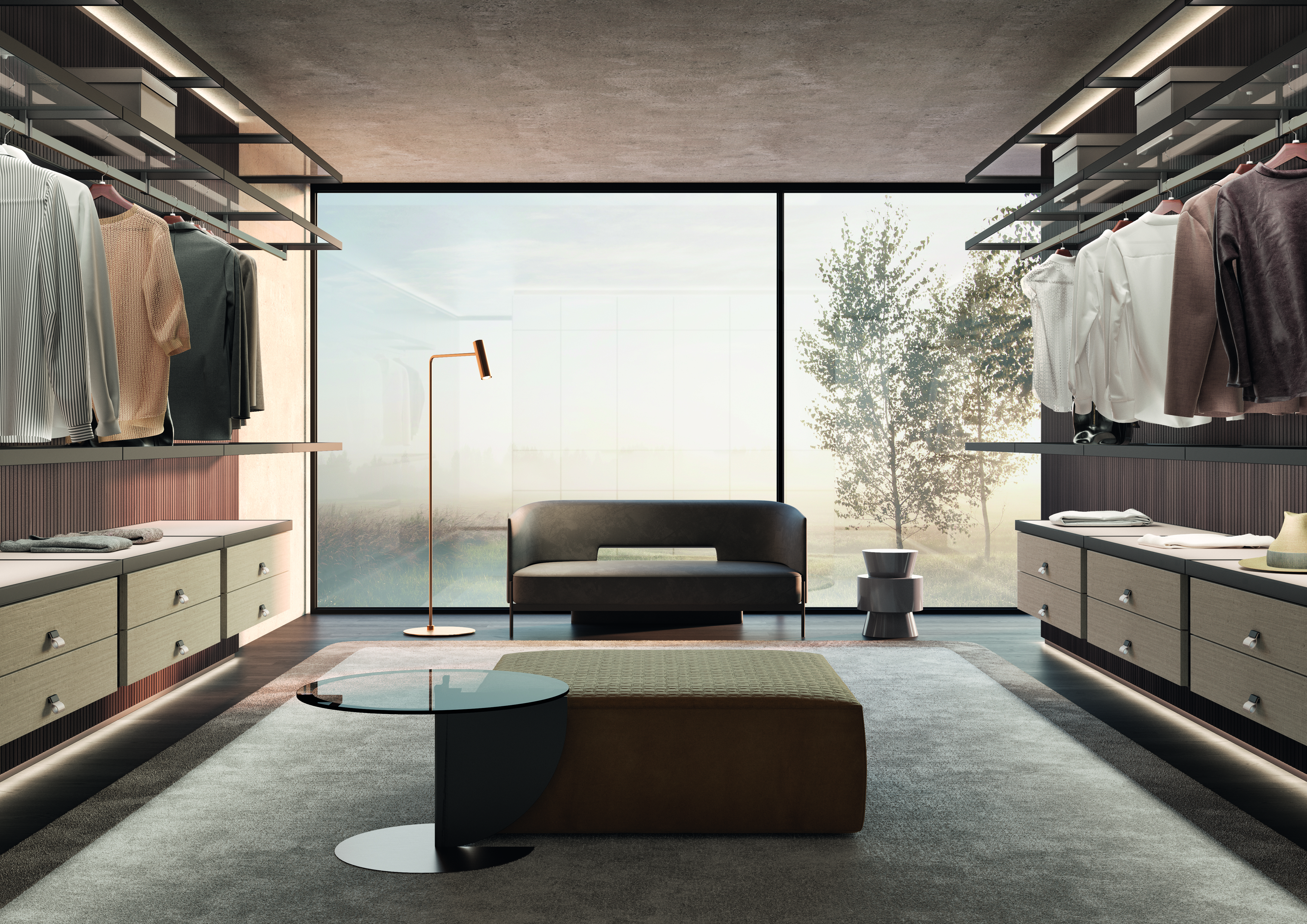The complete integration of the supporting structure with the Palo Alto Free and Palo Alto I-Box walk-in closet systems opens up an infinite range of furnishing possibilities and allows you to create a bewitching dialogue between materials of unparalleled quality.