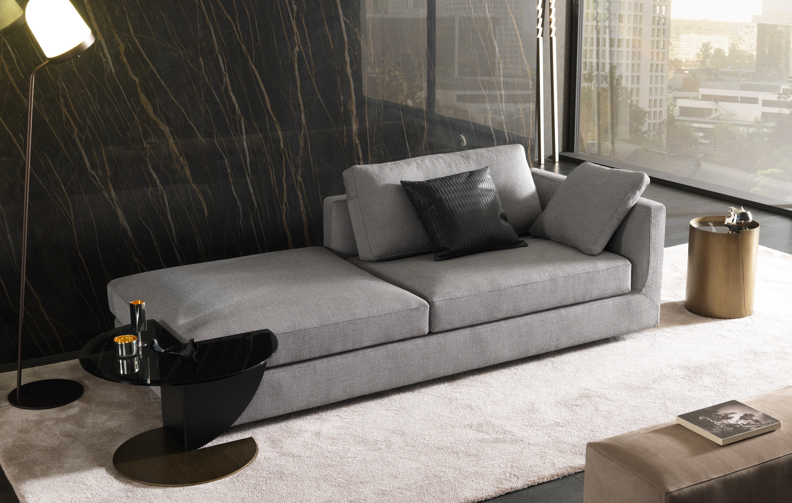 Whether chosen in its fixed version or in its modular version - including dormeuse, pouf and chaise longue - its enveloping volumes are configured as the perfect interpreters of a philosophy marked by relaxation.