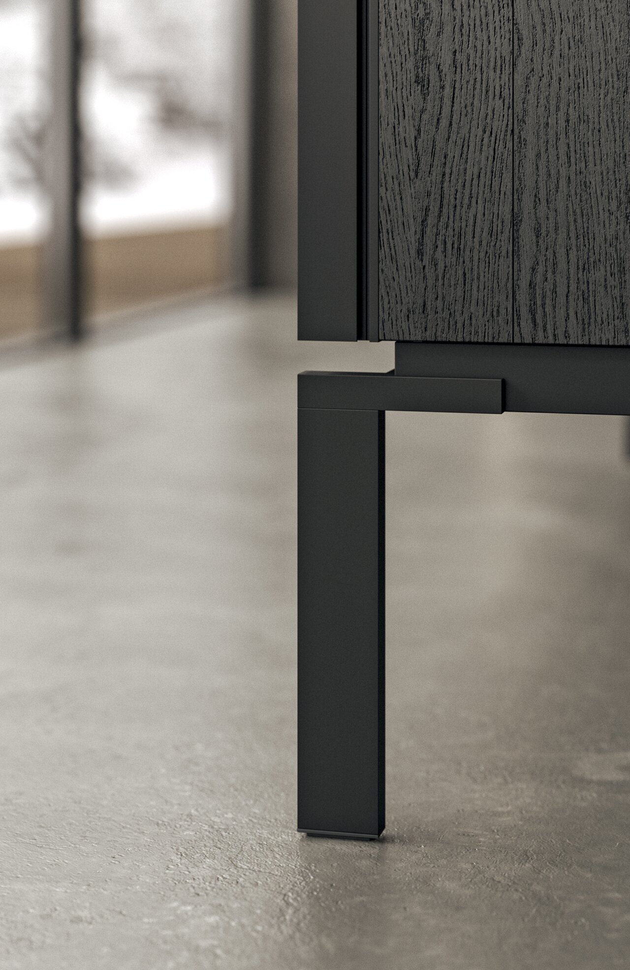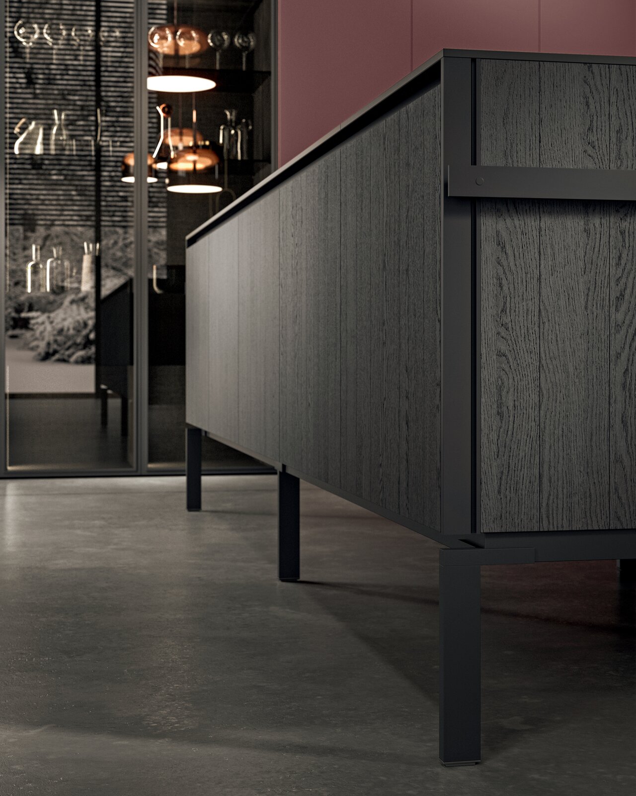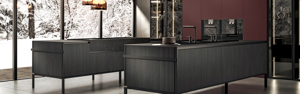 Regula, born in 1998, has never ceased to grow, to this day carrying forward its concept of extreme lightness. An environment that revolves around two islands suspended on feet, both characterized by a central monoblock in Greek Black stoneware that interrupts the worktop, generating an area with an integrated stoneware sink and an area with a cooktop, respectively. They form the backdrop to a wall of Reflex glass columns illuminated with vertical LEDs and interrupted in the central part by four Jaipur Red Fenix columns containing ovens and refrigerator.