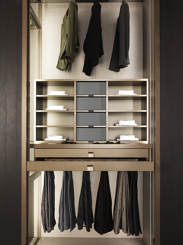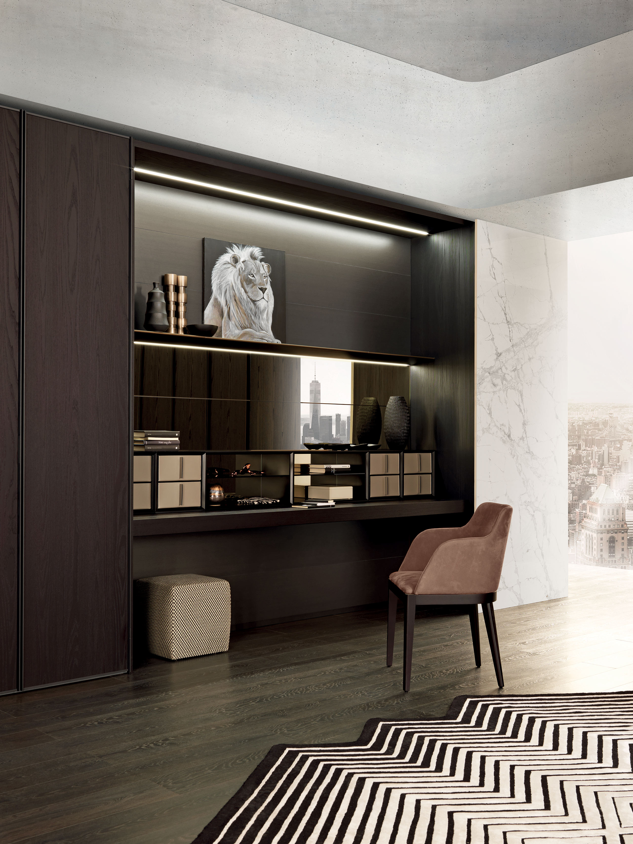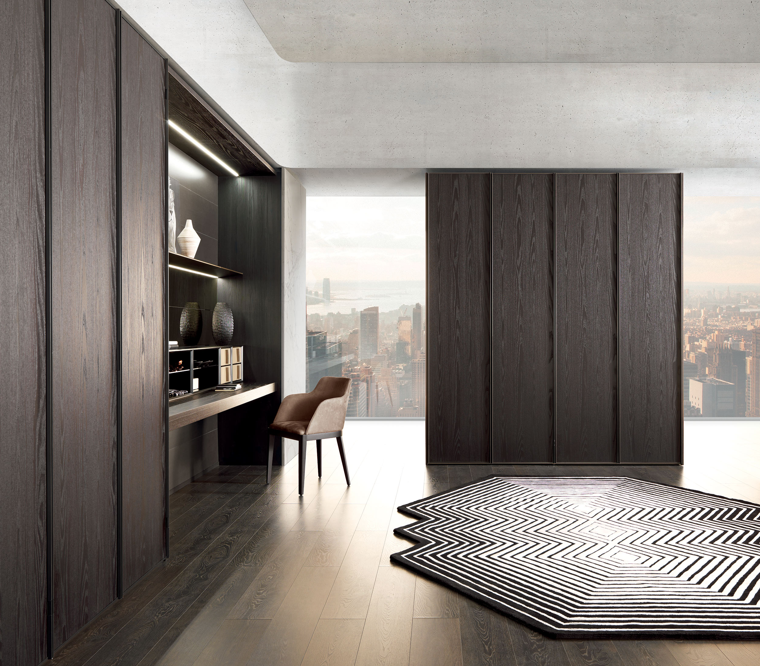 The refined metallic accents of the frame define and illuminate the bedroom, creating harmonious material contrasts in the versions combined with wood.