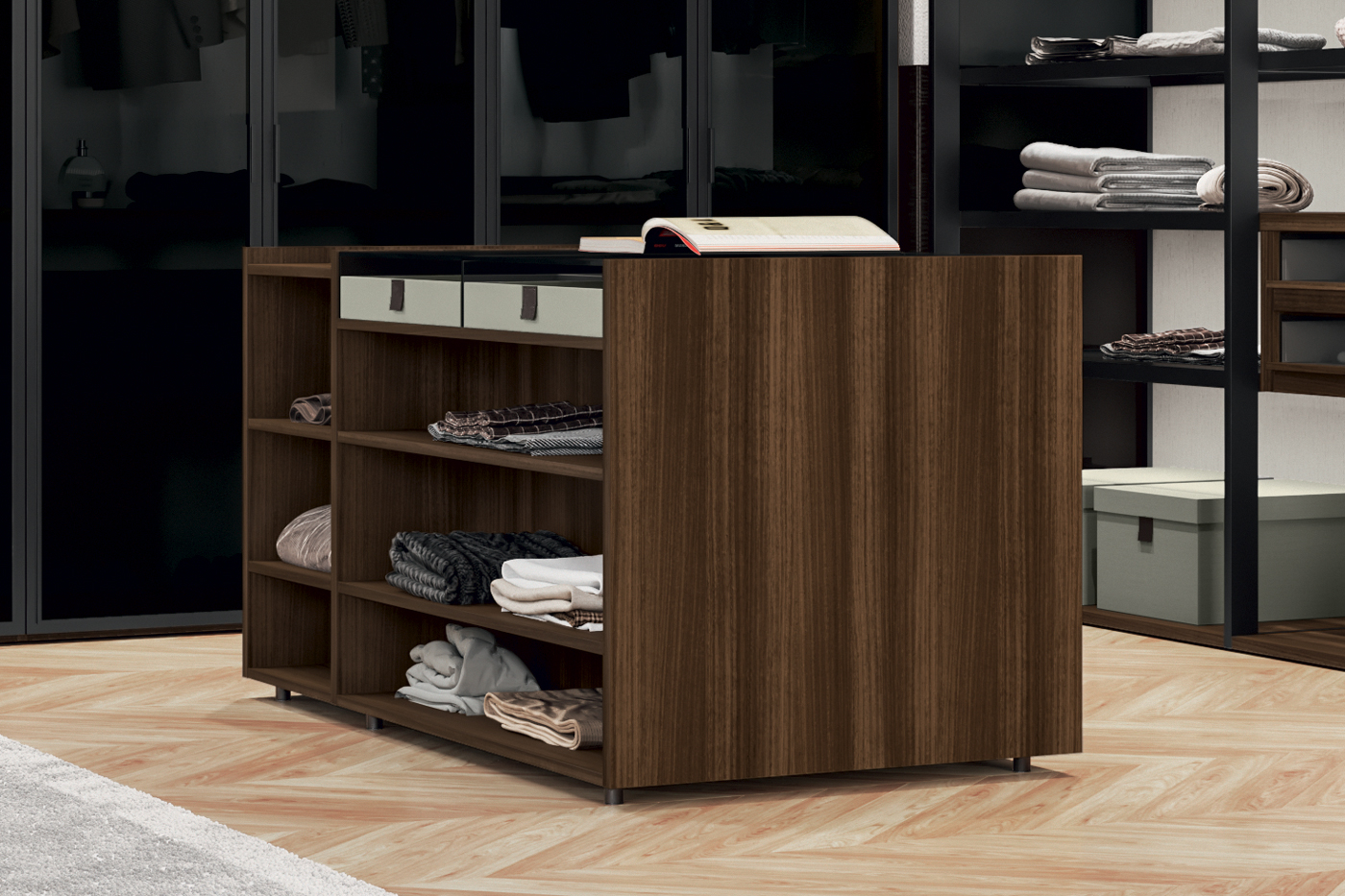 Structure: Eucalyptus laminate.Double-faced drawer unit for the center of the room.