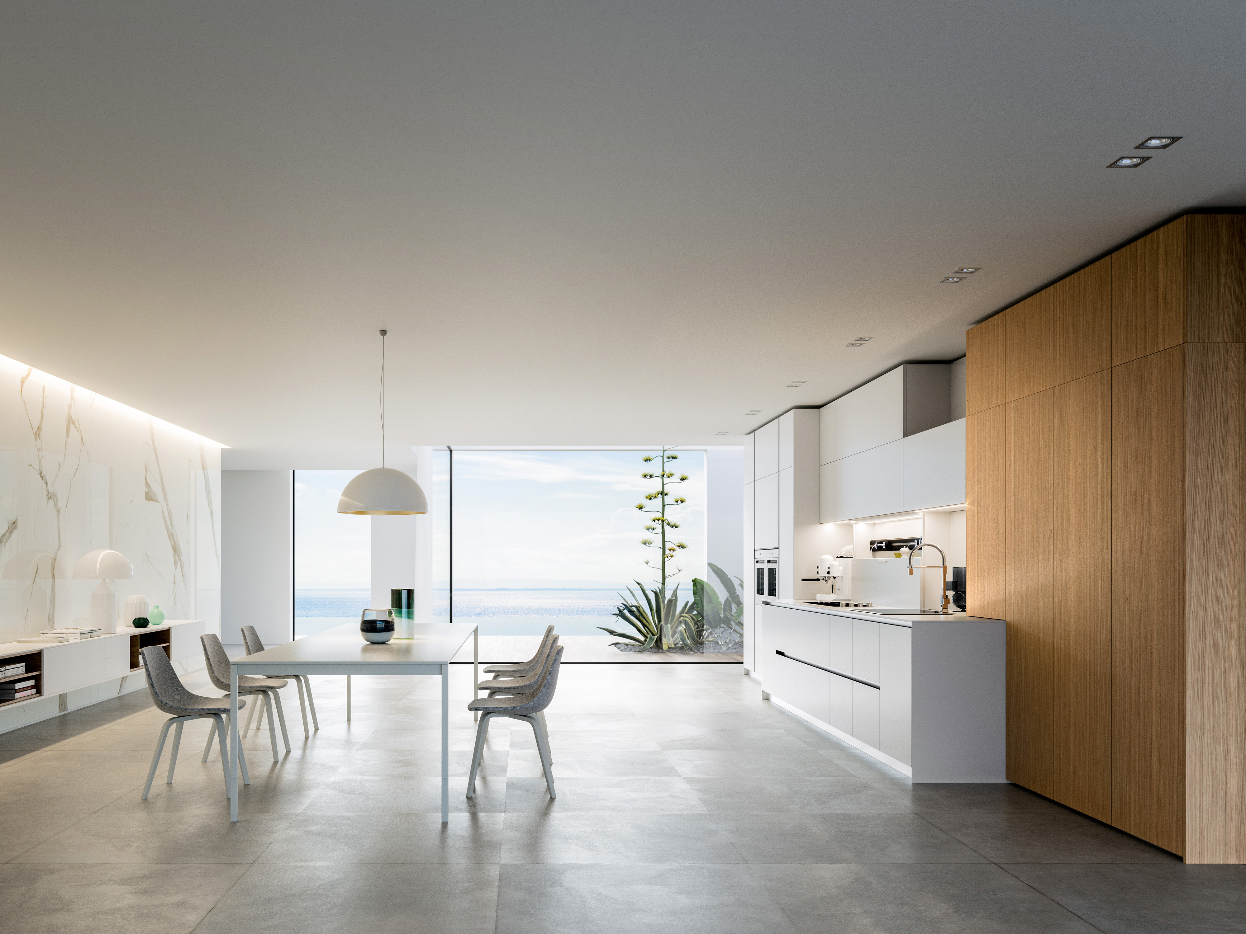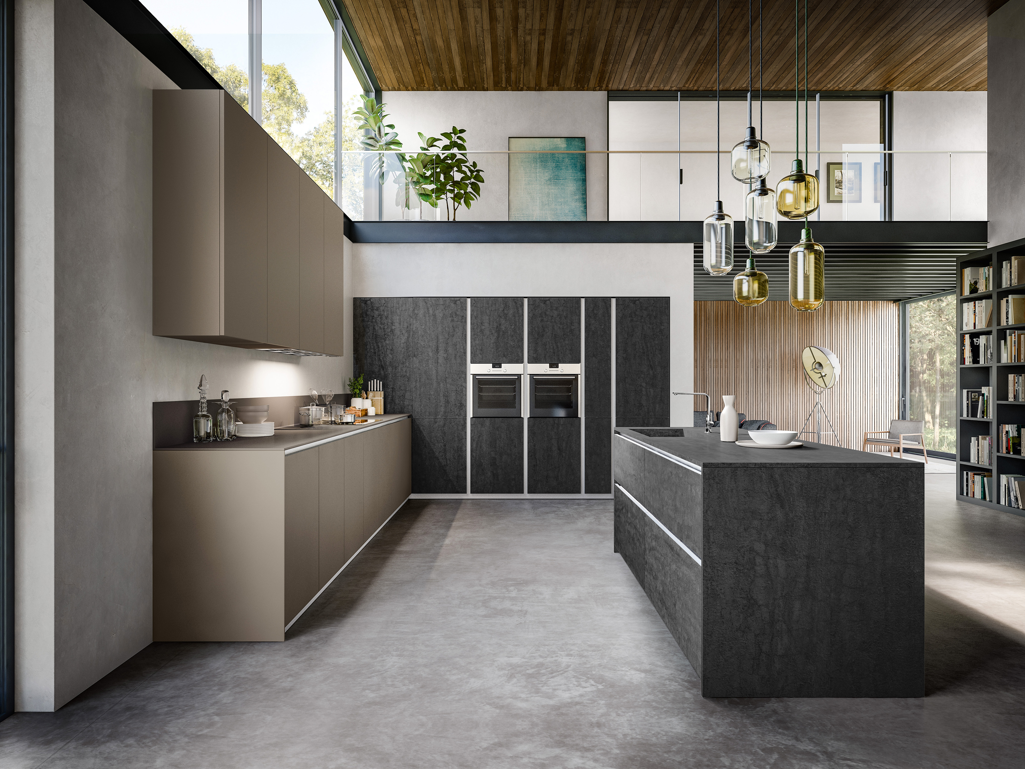 A kitchen that interprets modernity, combining the elegance of innovative materials with the technology of the cabinet doors with aluminium frames. The resulting spaces are functional, beautiful and enhanced by elegant reflections from the glass and the rich texture of materials such as Laminam, also available for worktops.