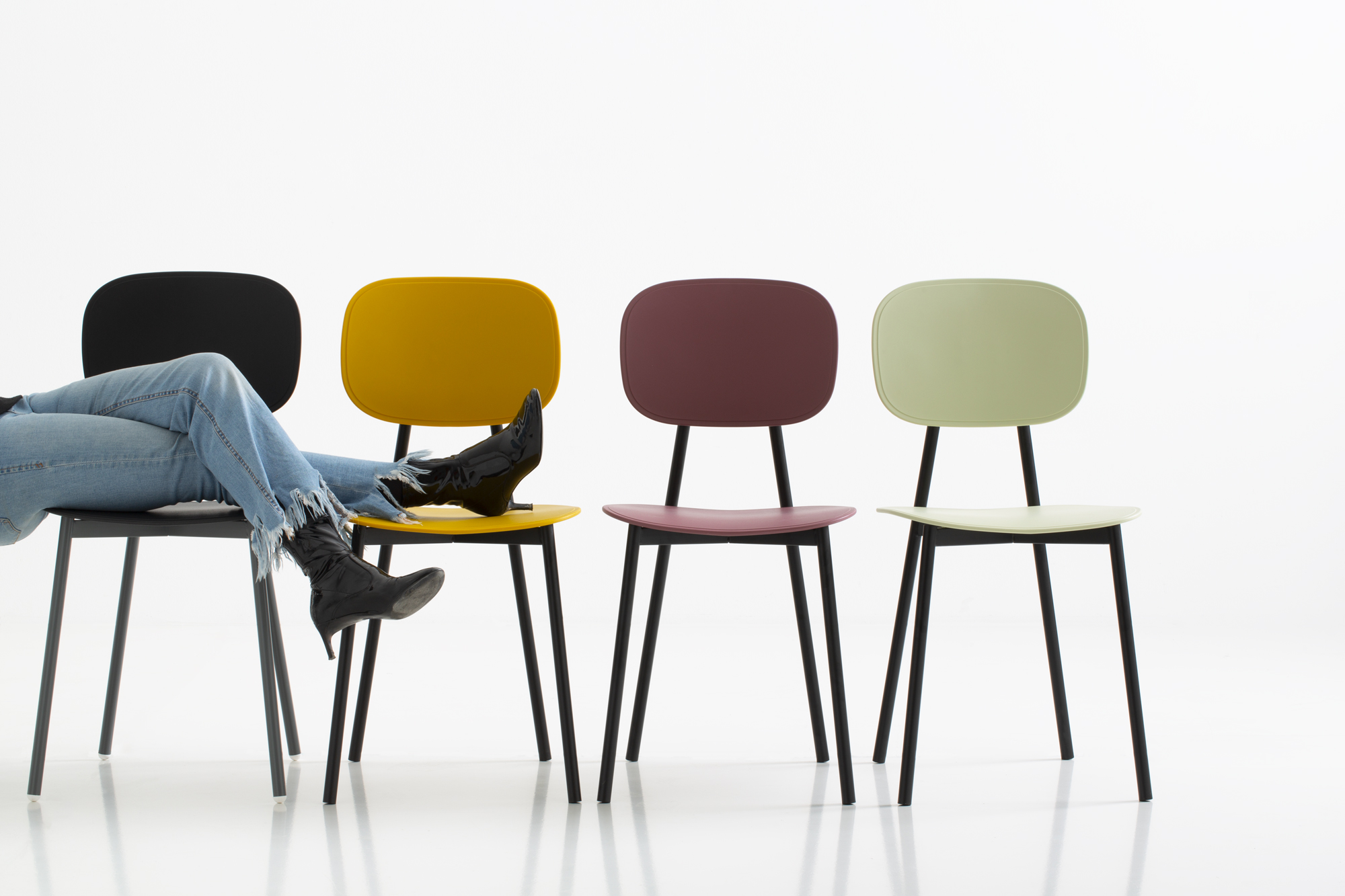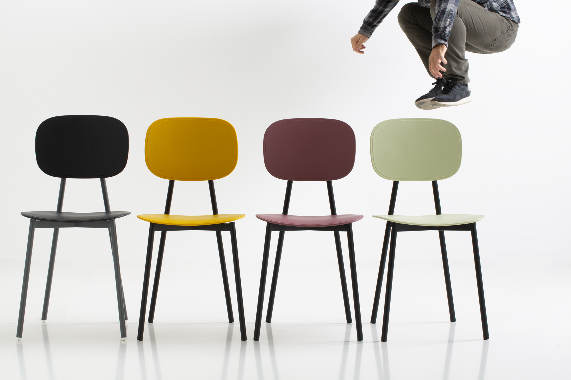 Seat and backrest available in glass-fibre reinforced polypropylene, in melamine-faced multilayer or covered in fabric in different colours and textures.