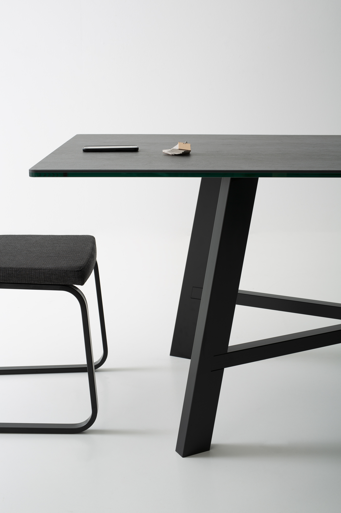 Central base made of epoxy powder coated tubular metal. Special feature of the base is the visible joints made by laser cutting technology.