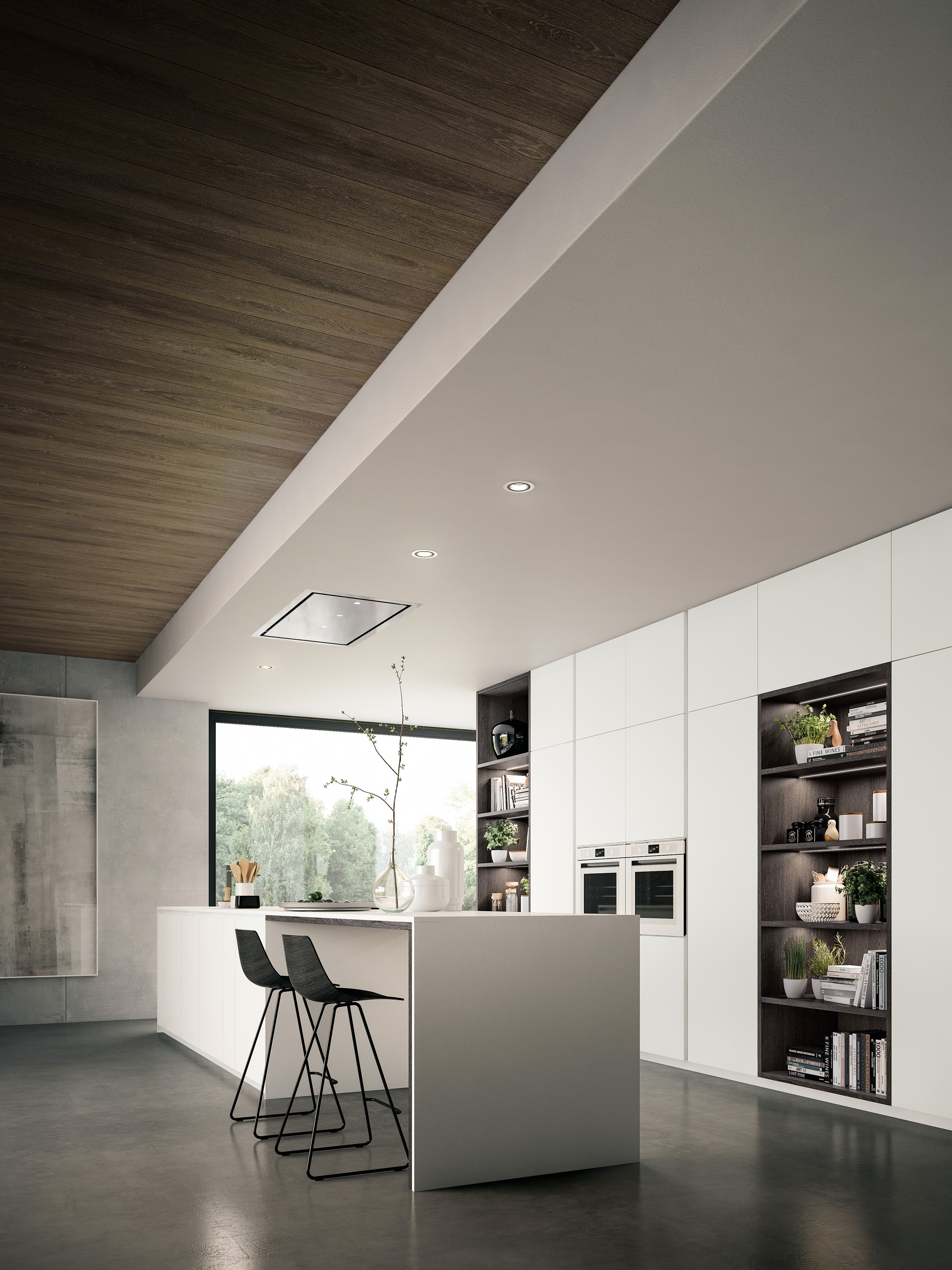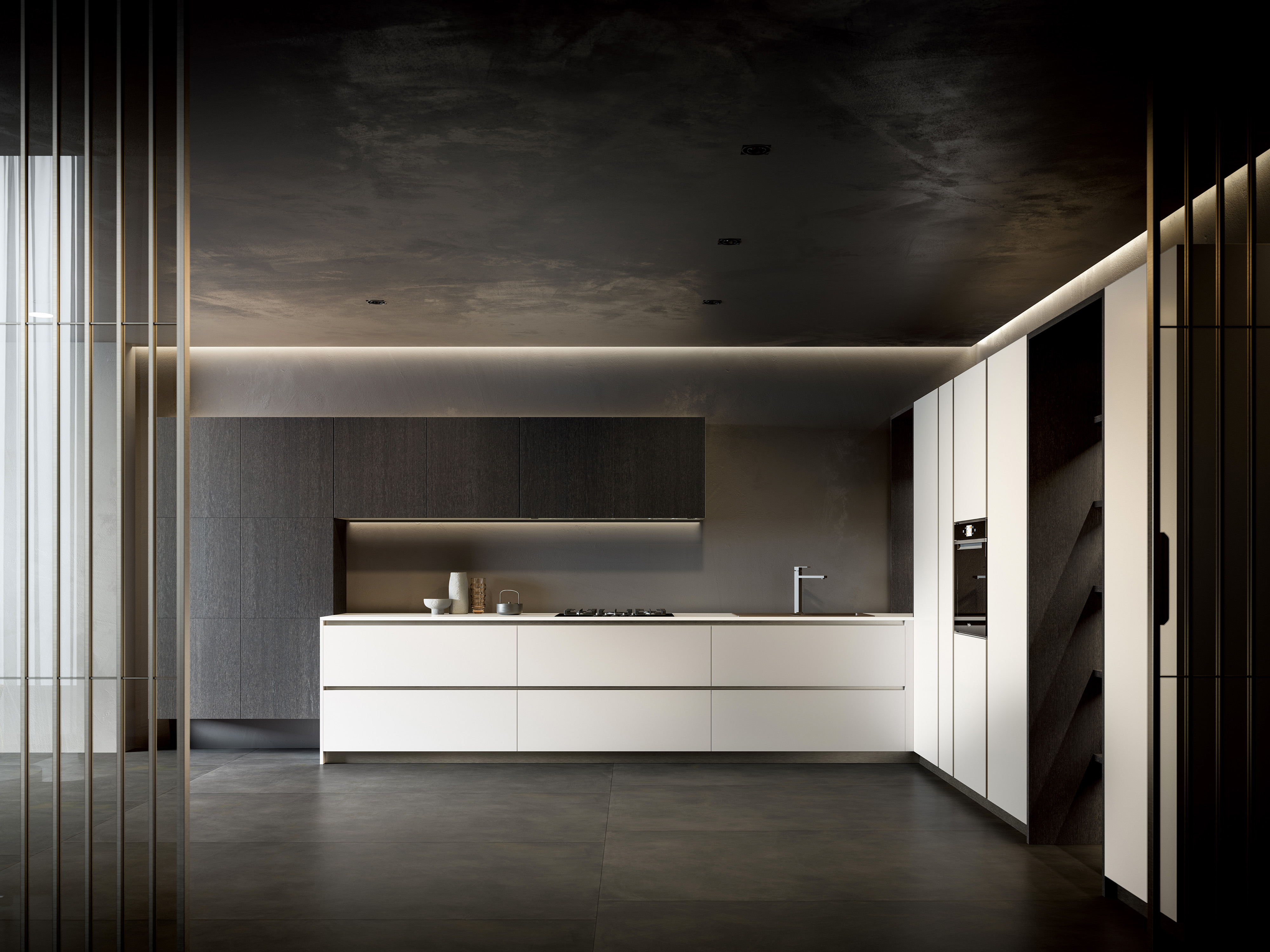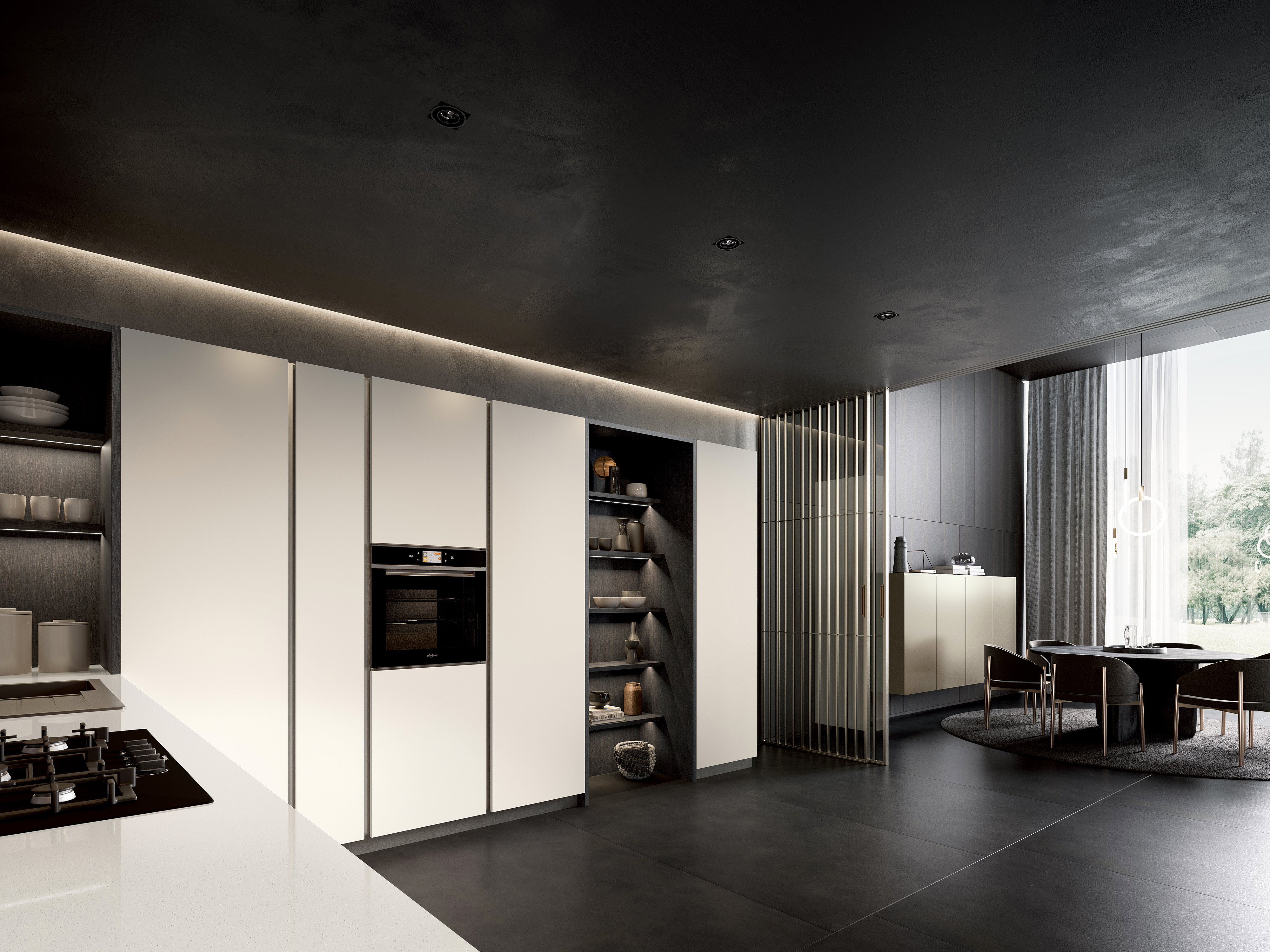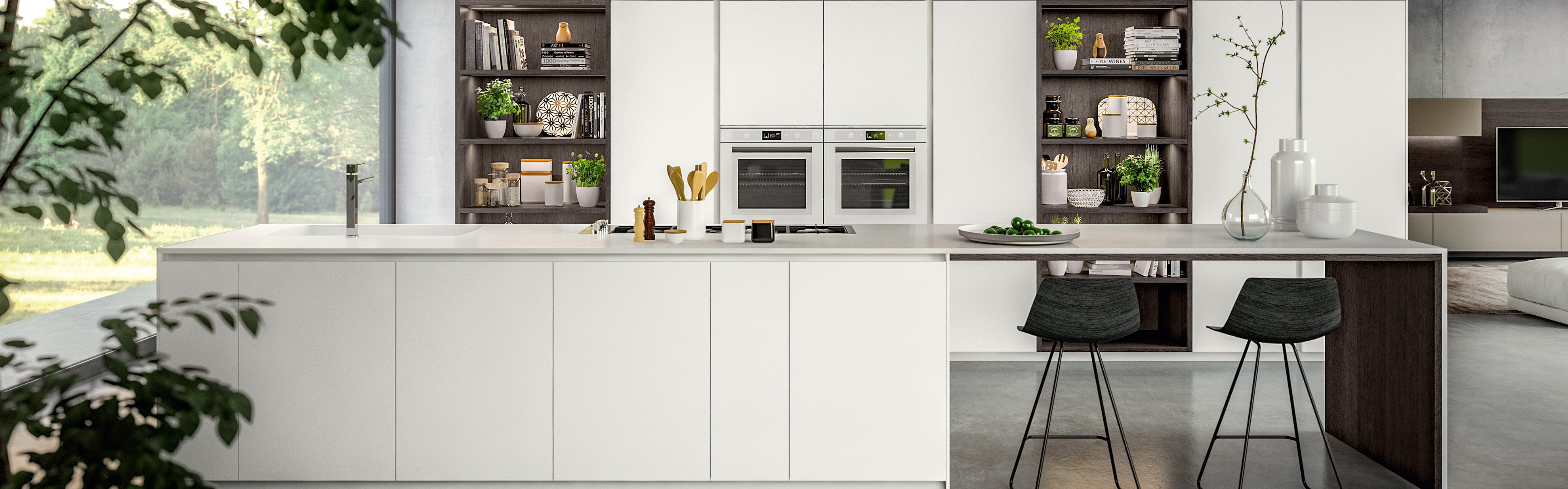 Essential forms, clean geometries and architectural elements integrated with the living area. An ideal design with a focus on practicality and a contemporary style with which to enjoy family life. Functional solutions to achieve total freedom of composition, where a refined design keeps a close eye on the aesthetics of the new ways of inhabiting the kitchen space today and in the future.