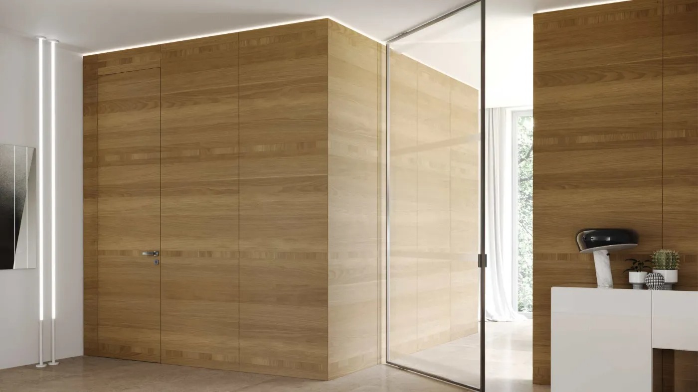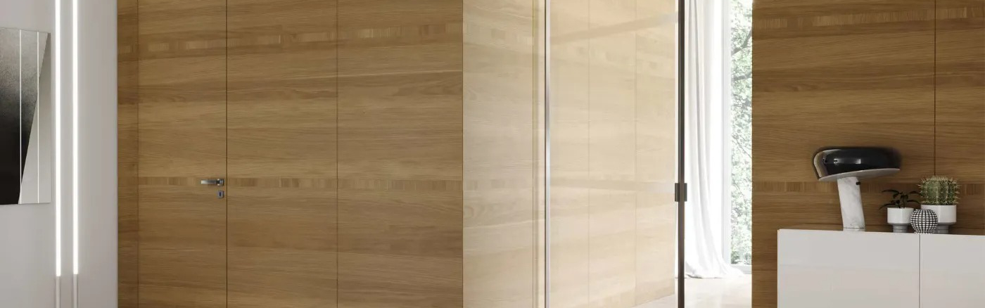The wood pore, a living material that changes over time, is left open. The door leaf is veneered with multiple layers of veneers of fine wood species, jointed with vertical and horizontal grain.