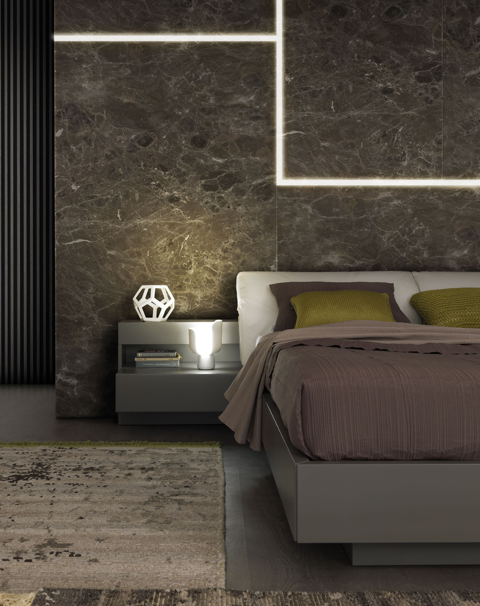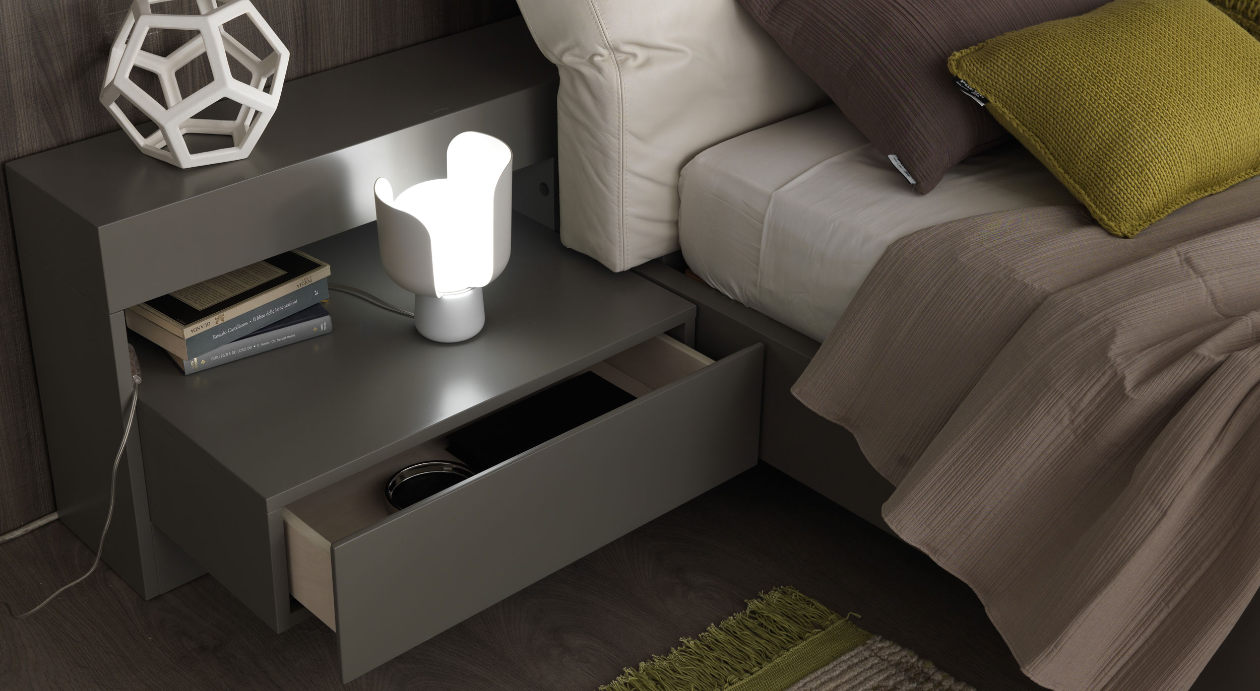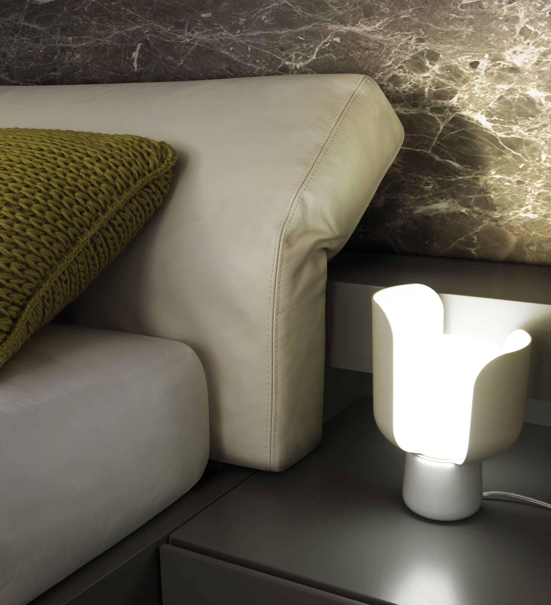 The headboard, consisting of two upholstered cushions adjustable in different positions, is inserted on a multifunctional structure where two bedside units with incorporated lights are placed and objects can be positioned.