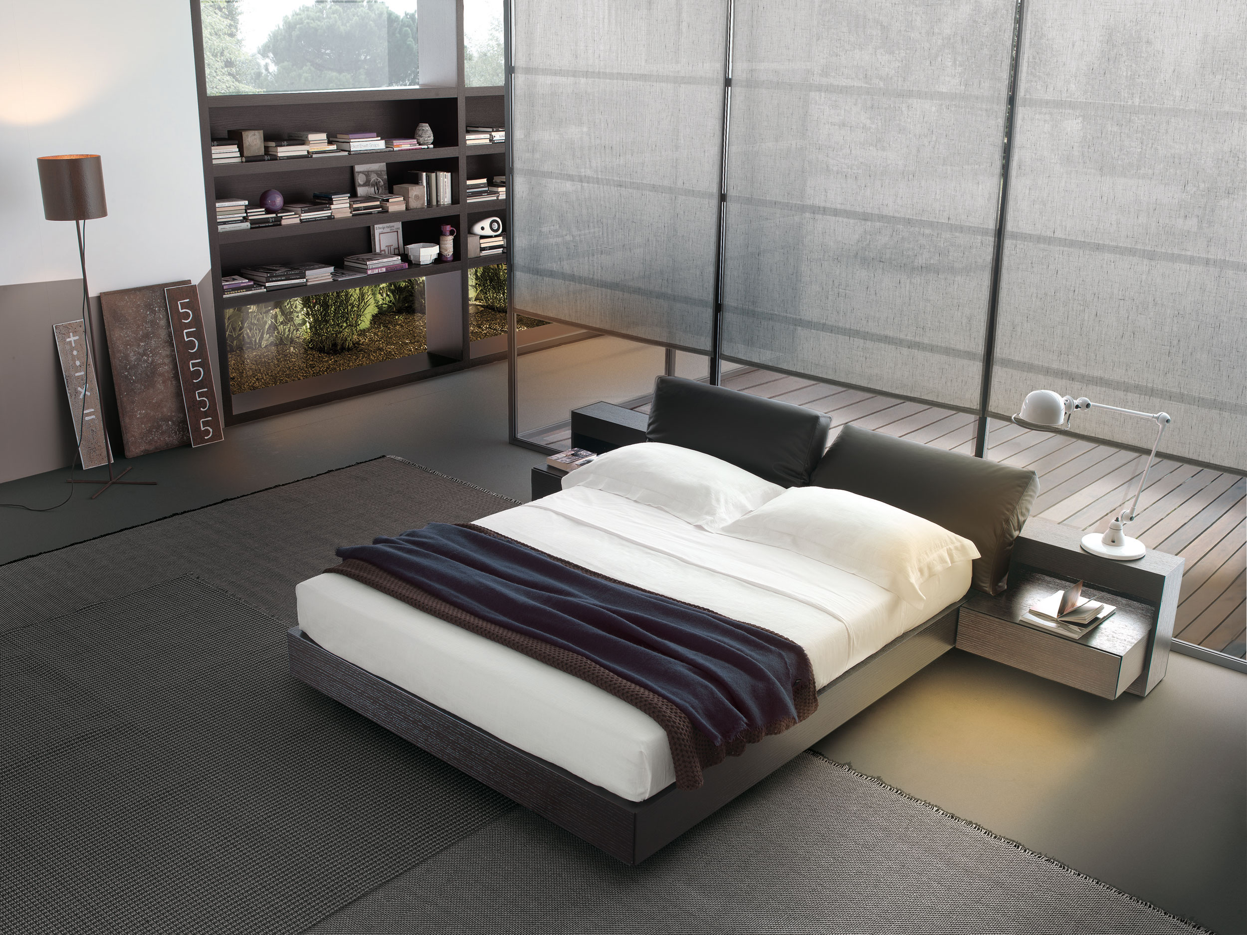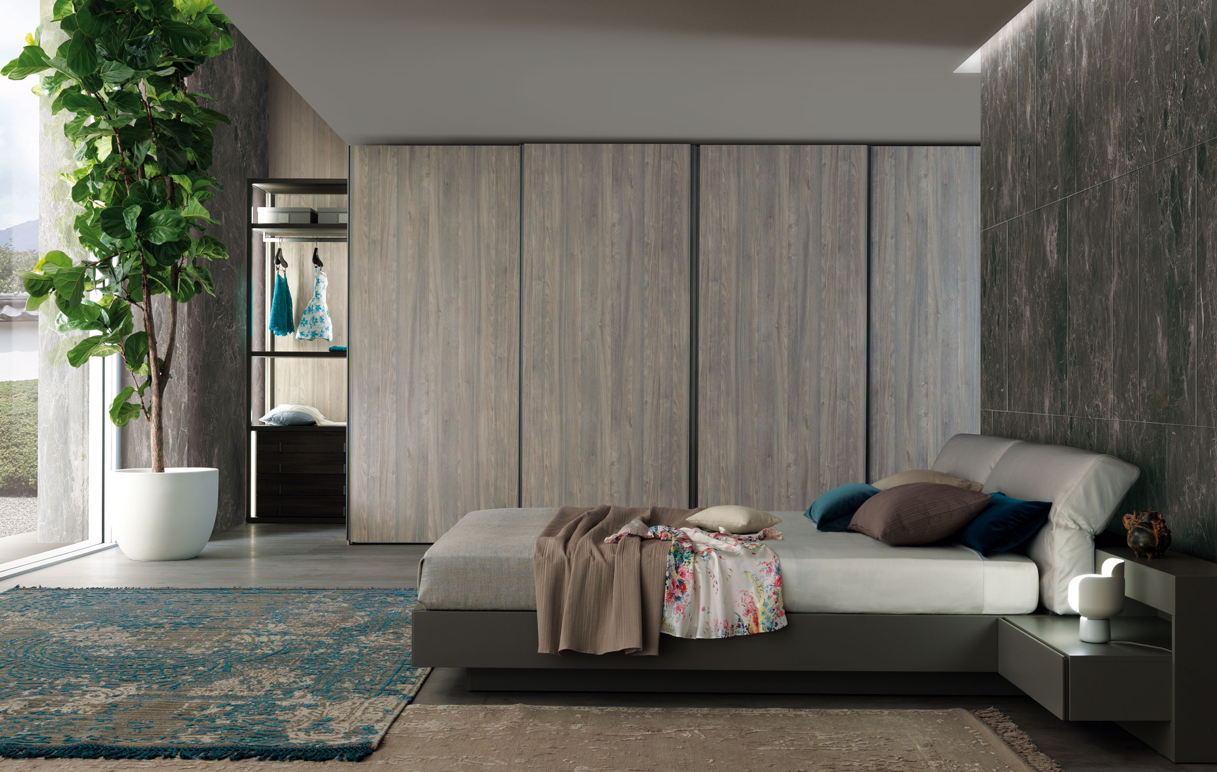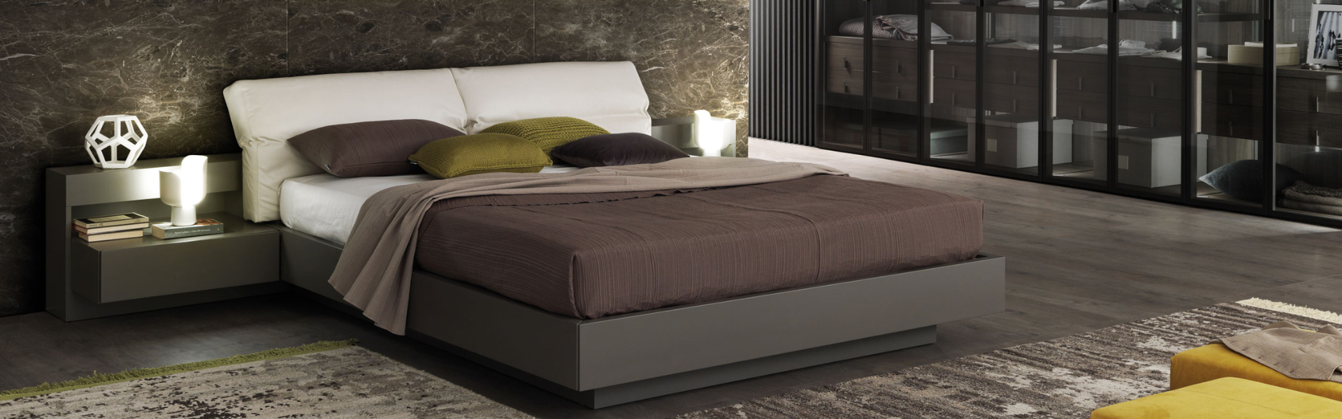 The headboard, consisting of two upholstered cushions adjustable in different positions, is inserted on a multifunctional structure where two bedside units with incorporated lights are placed and objects can be positioned.