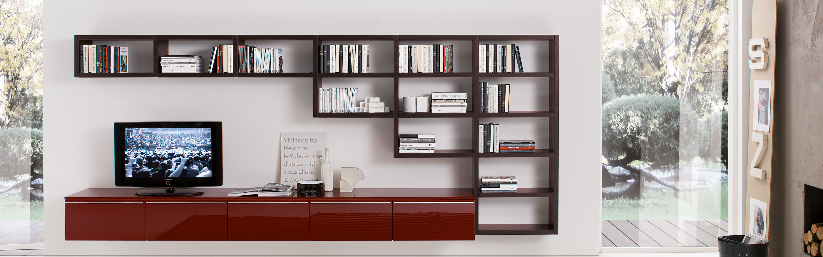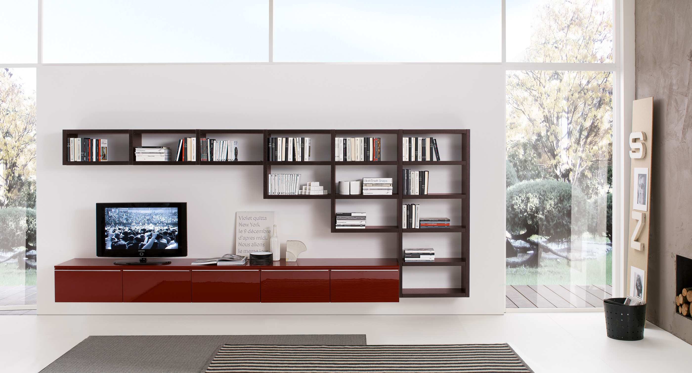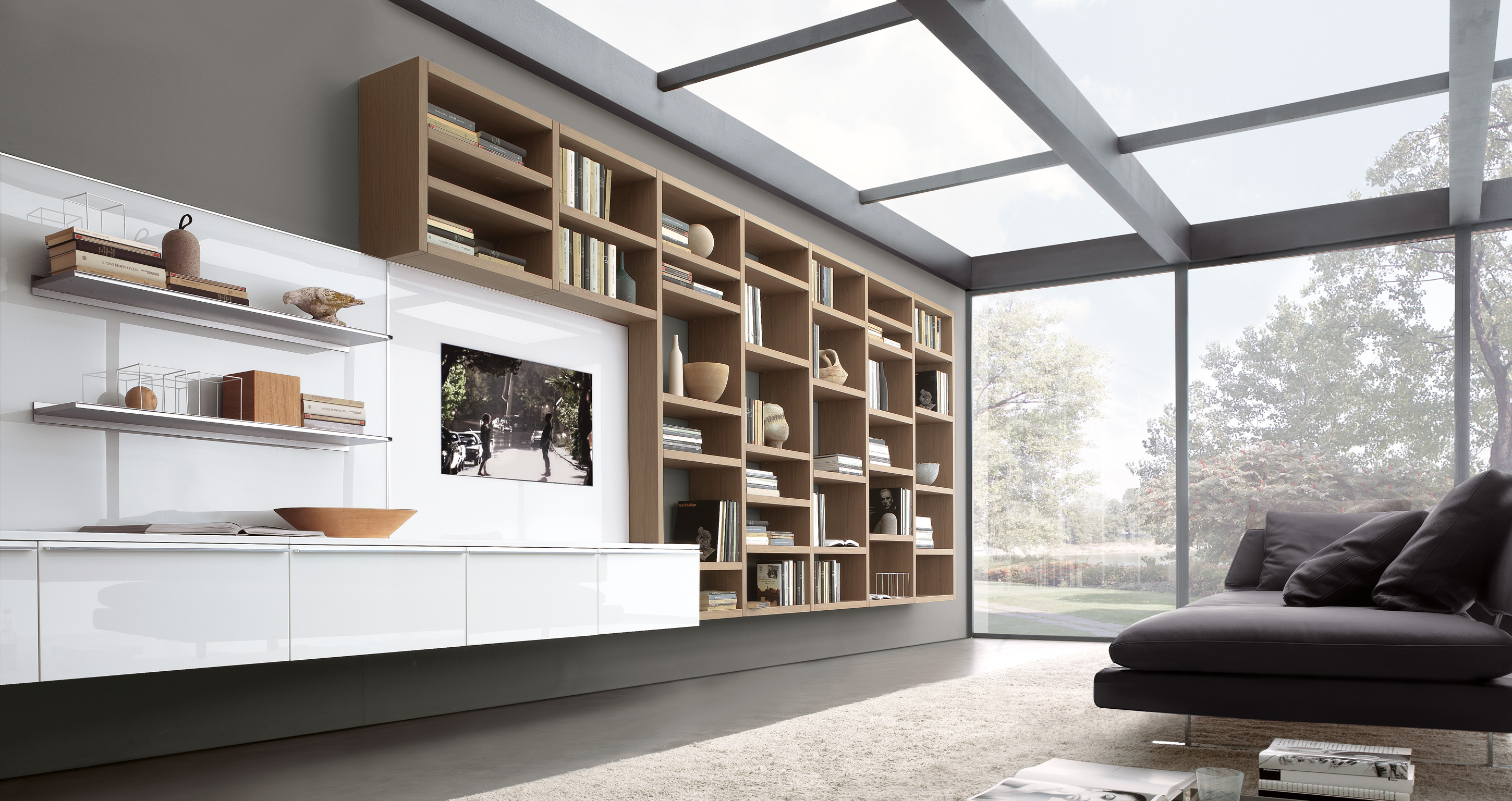 The compartments contain a special LED lighting system. Finishes: matte lacquer, glossy colours, natural wood, veneer/facing.