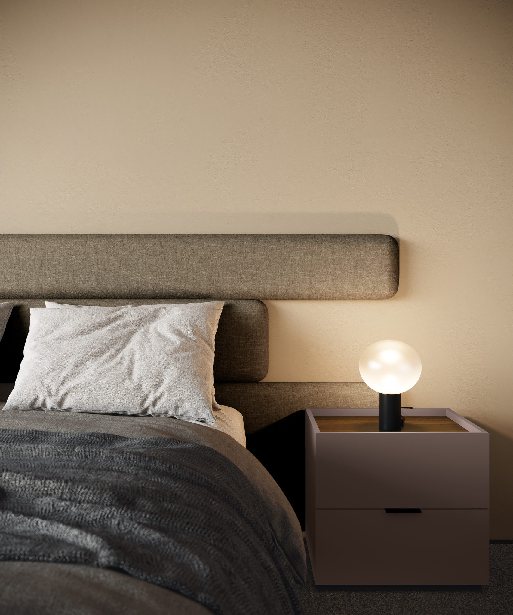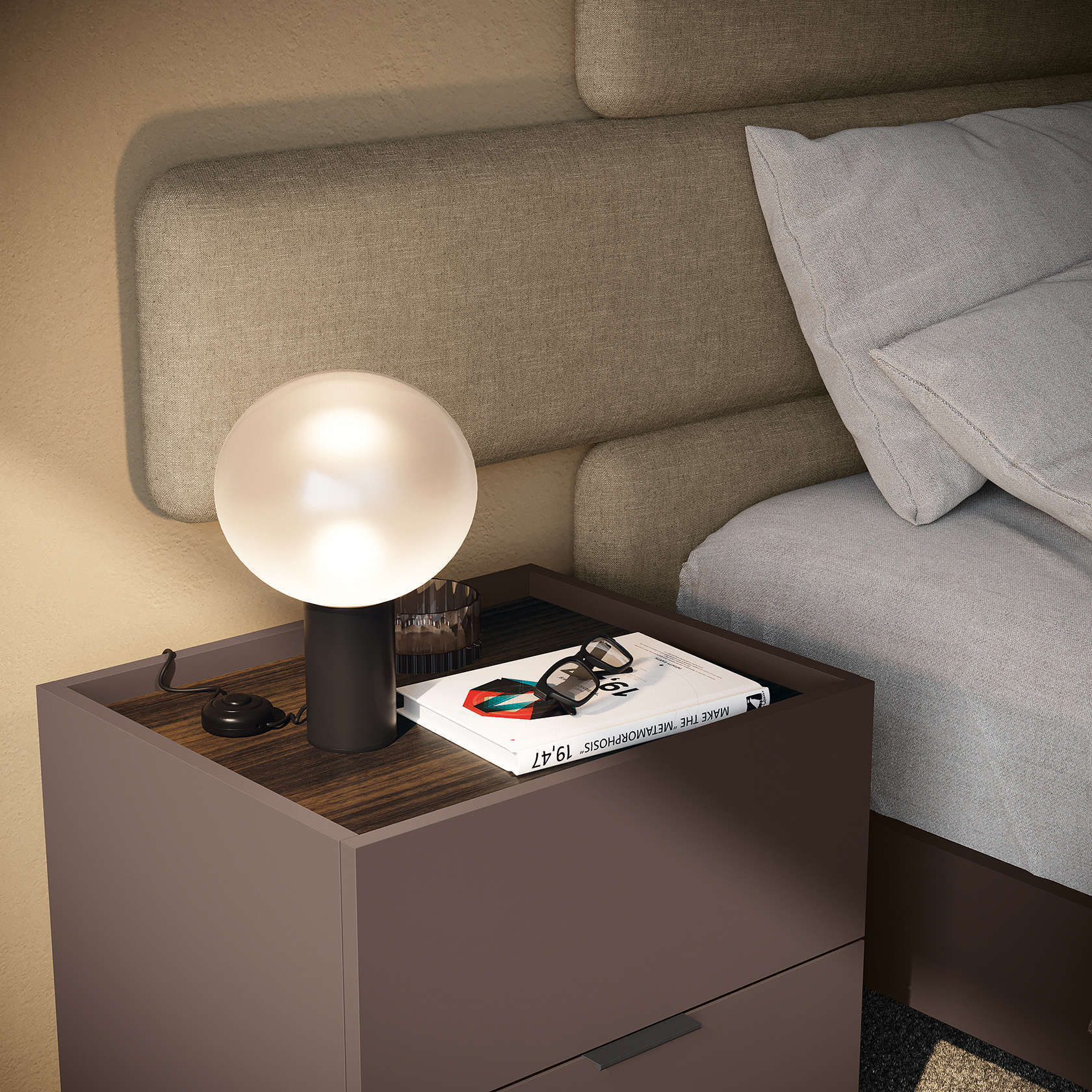 Dido bedroom set in matt lacquered Caff è with top and plinth in melamine-faced Eucalipto and handle in Carbon grey metal.