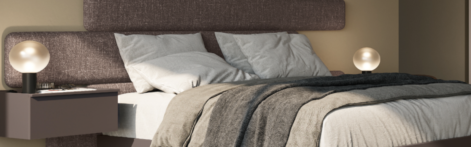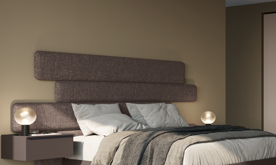 Desire bed with covering in Burana Sac fabric and Adair sommier in matt lacquered Caffè.
