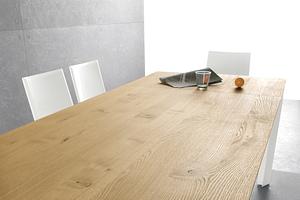 The table's top adopts the "Glue Point" system, which bonds a 6mm thick tempered glass, tempered glass with visible ceramic effect, laminated, or veneered surface onto a 12mm sub-panel. This solution provides a smooth, durable, and versatile surface that suits various settings.