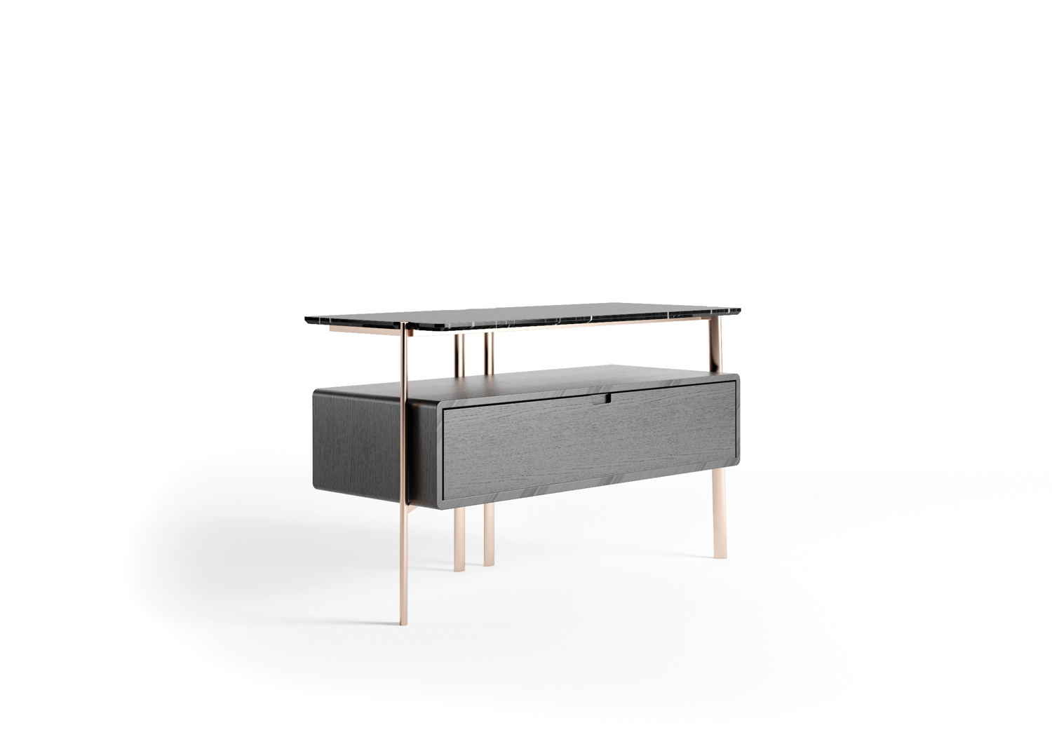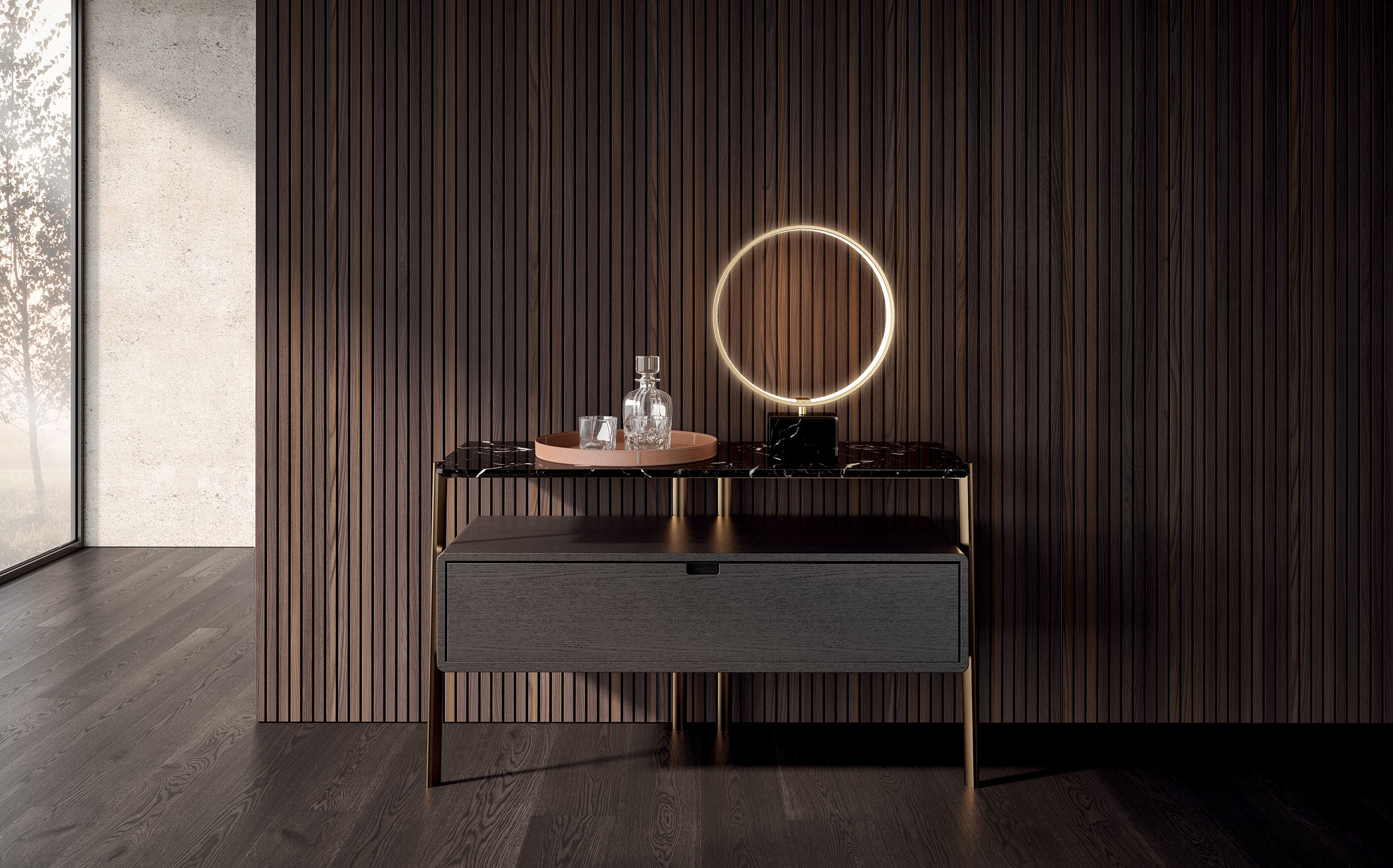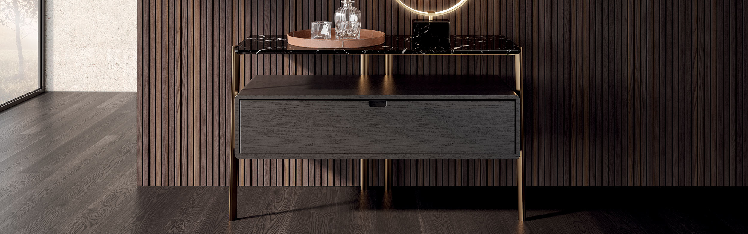 The Eros night group, consisting of a chest of drawers and bedside table, is characterized by the sophisticated dialogue between the different materials that compose it: metal, marble, wood.
