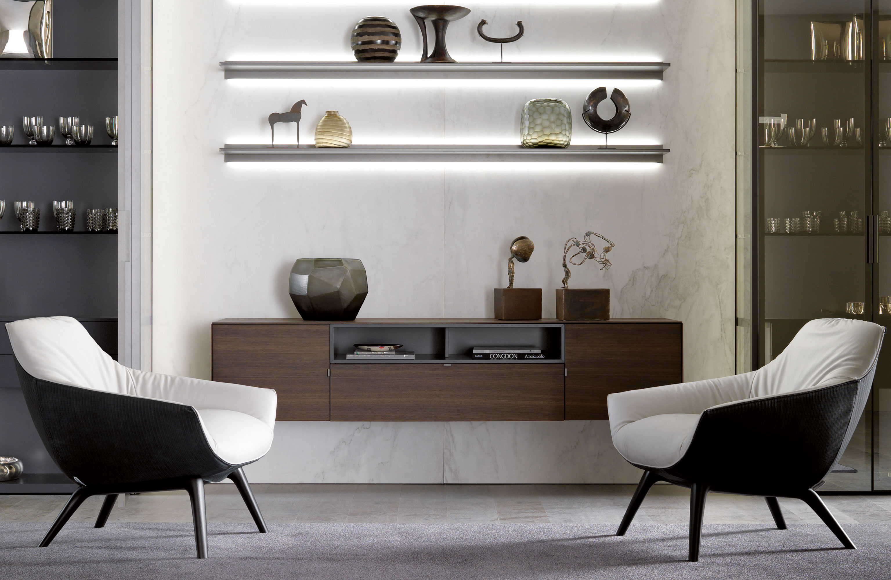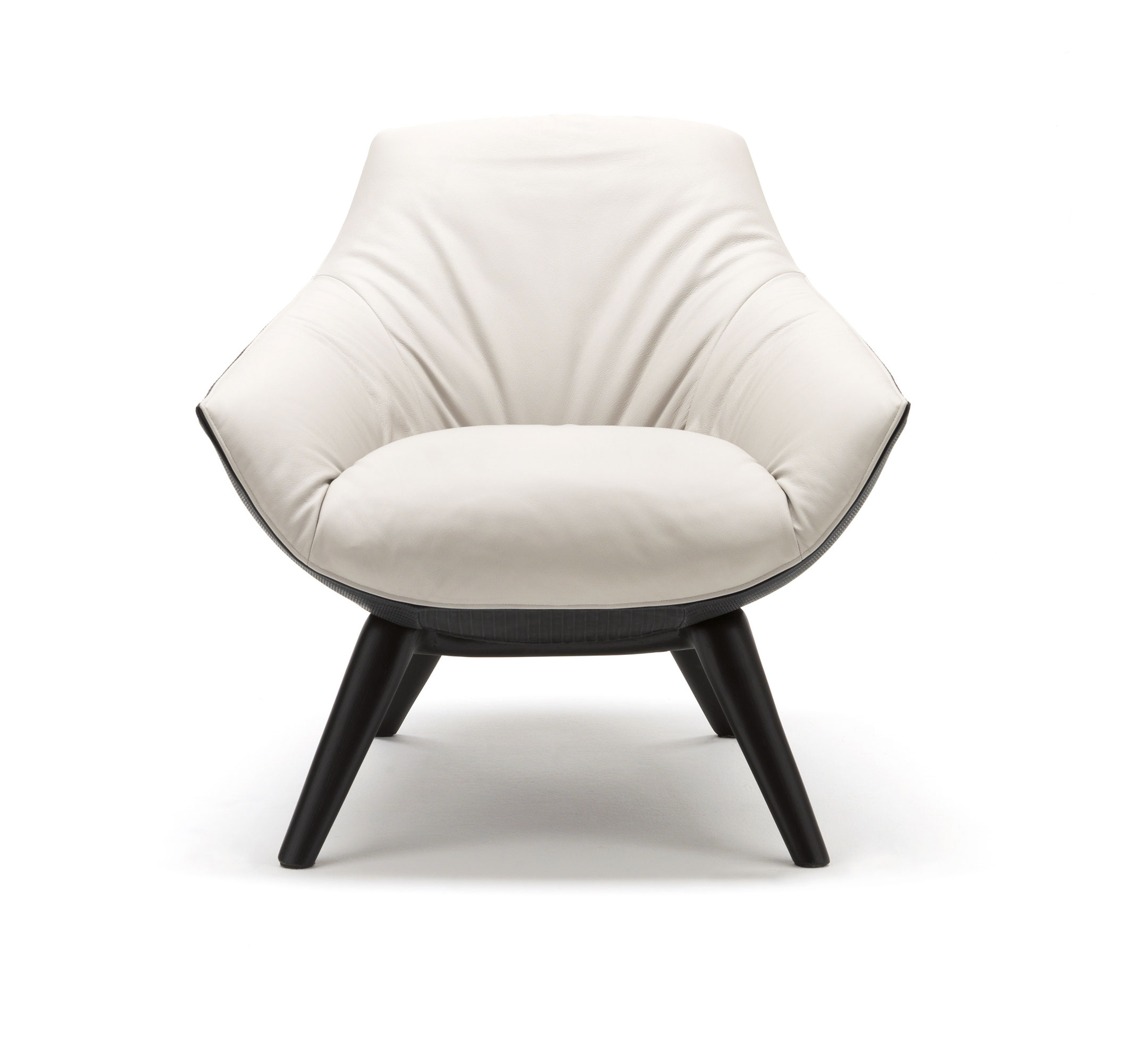 The base of the Florentia armchair enlivens the juxtaposition of the rigorously designed legs with the wraparound structure of the frame.