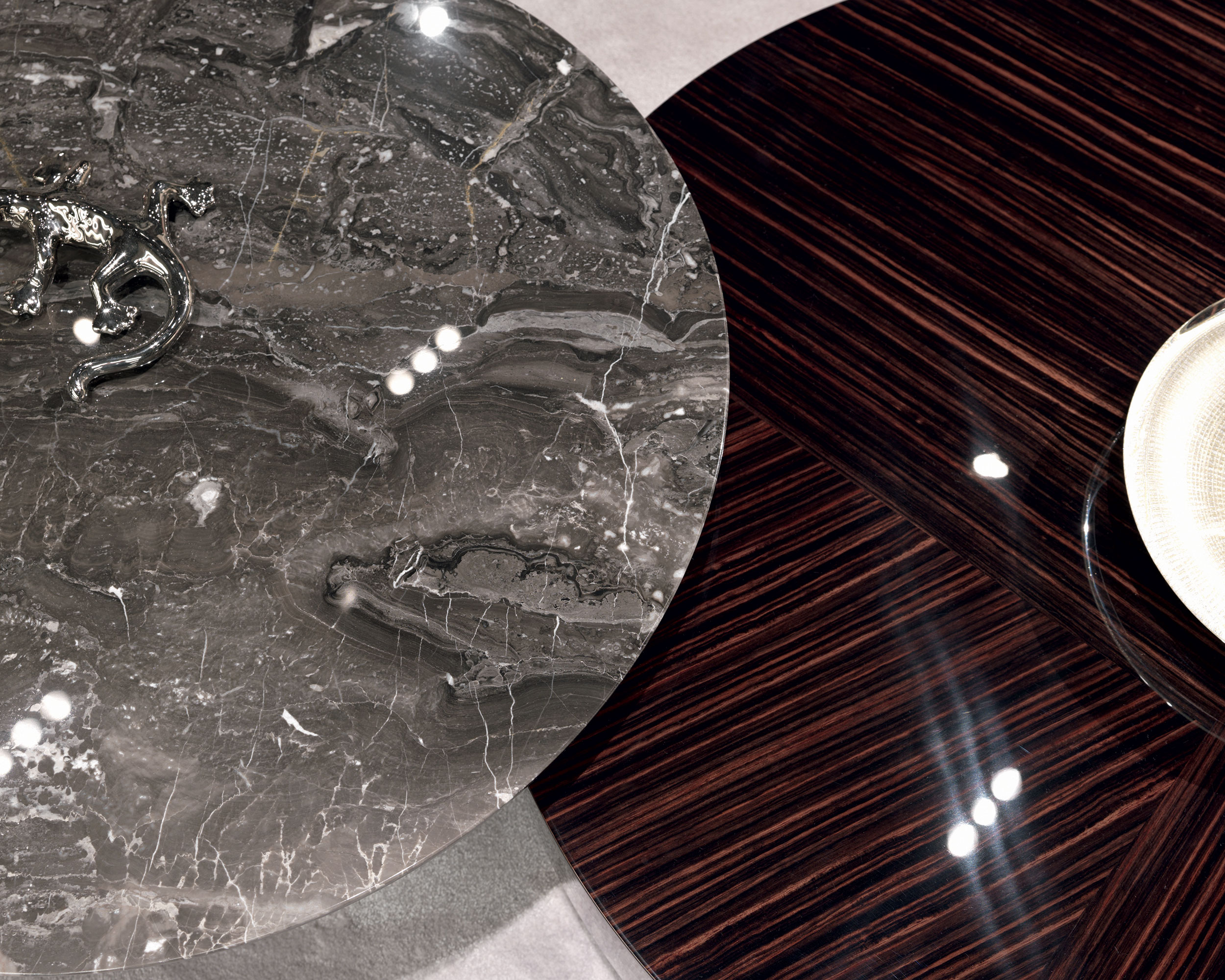 The material substance of wood establishes a dialogue with the glossy finish to add appeal to the pieces, conceived to elegantly furnish spaces in the home or elsewhere.