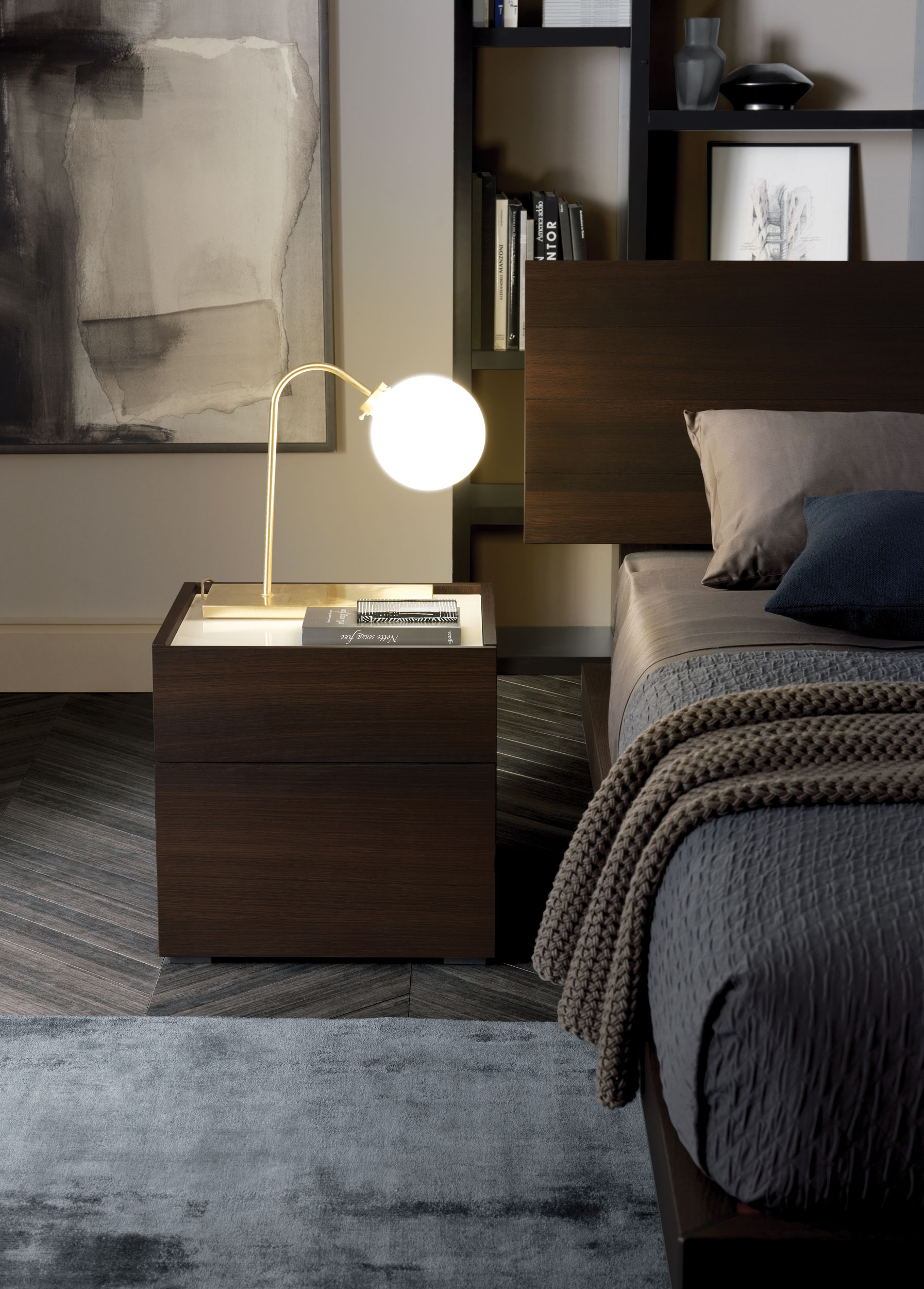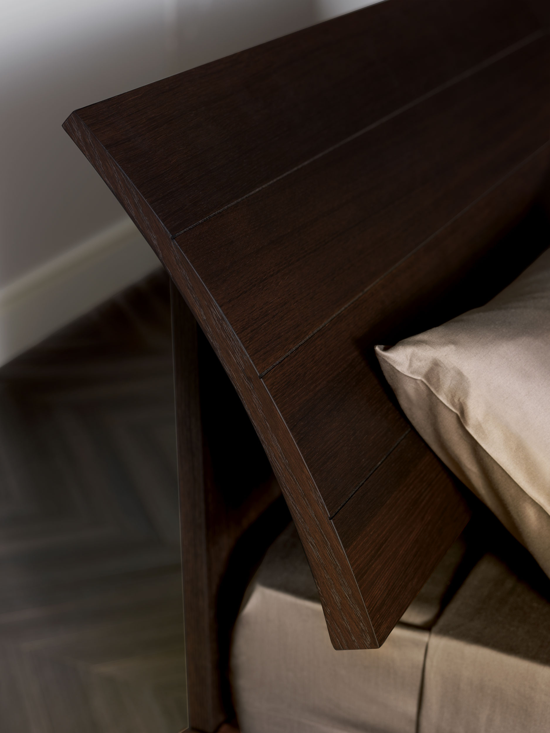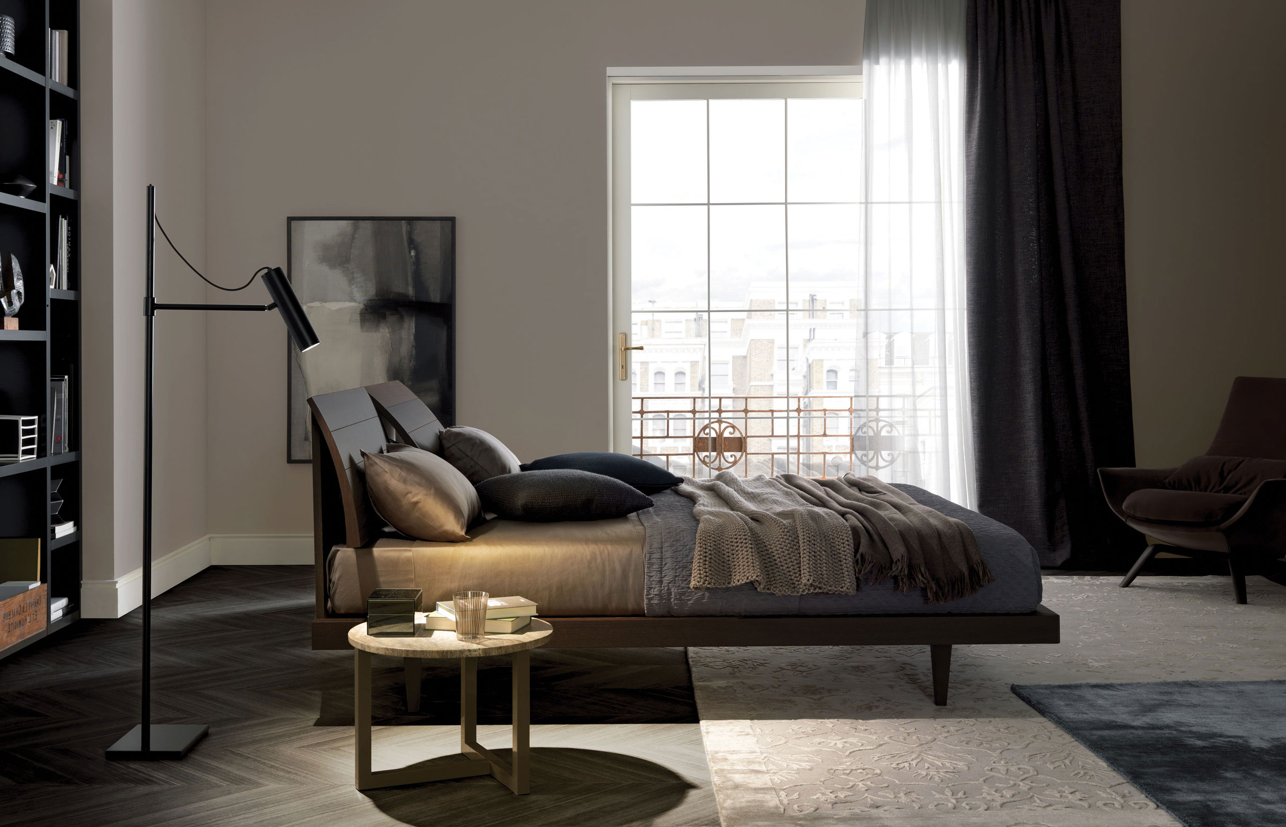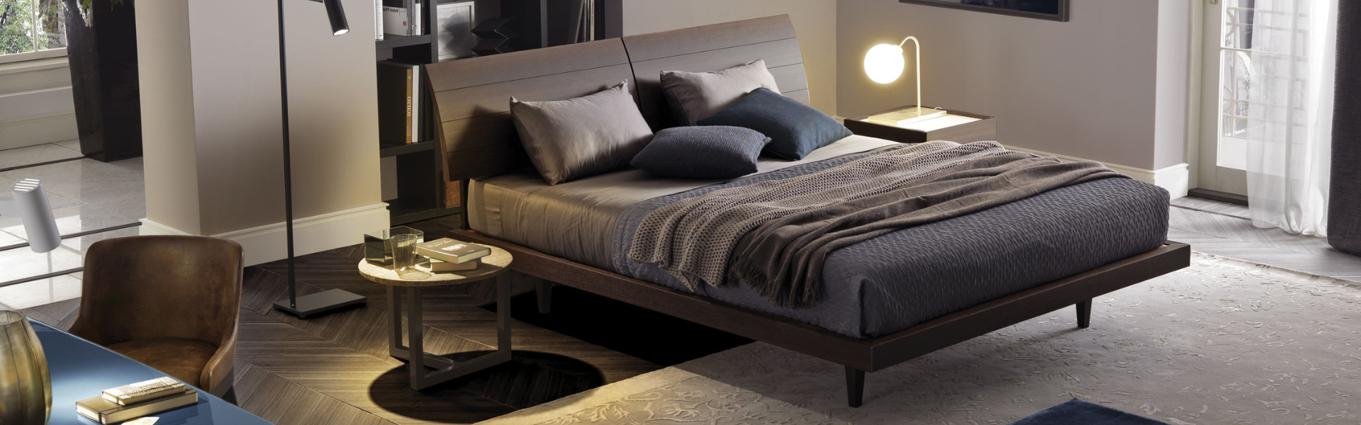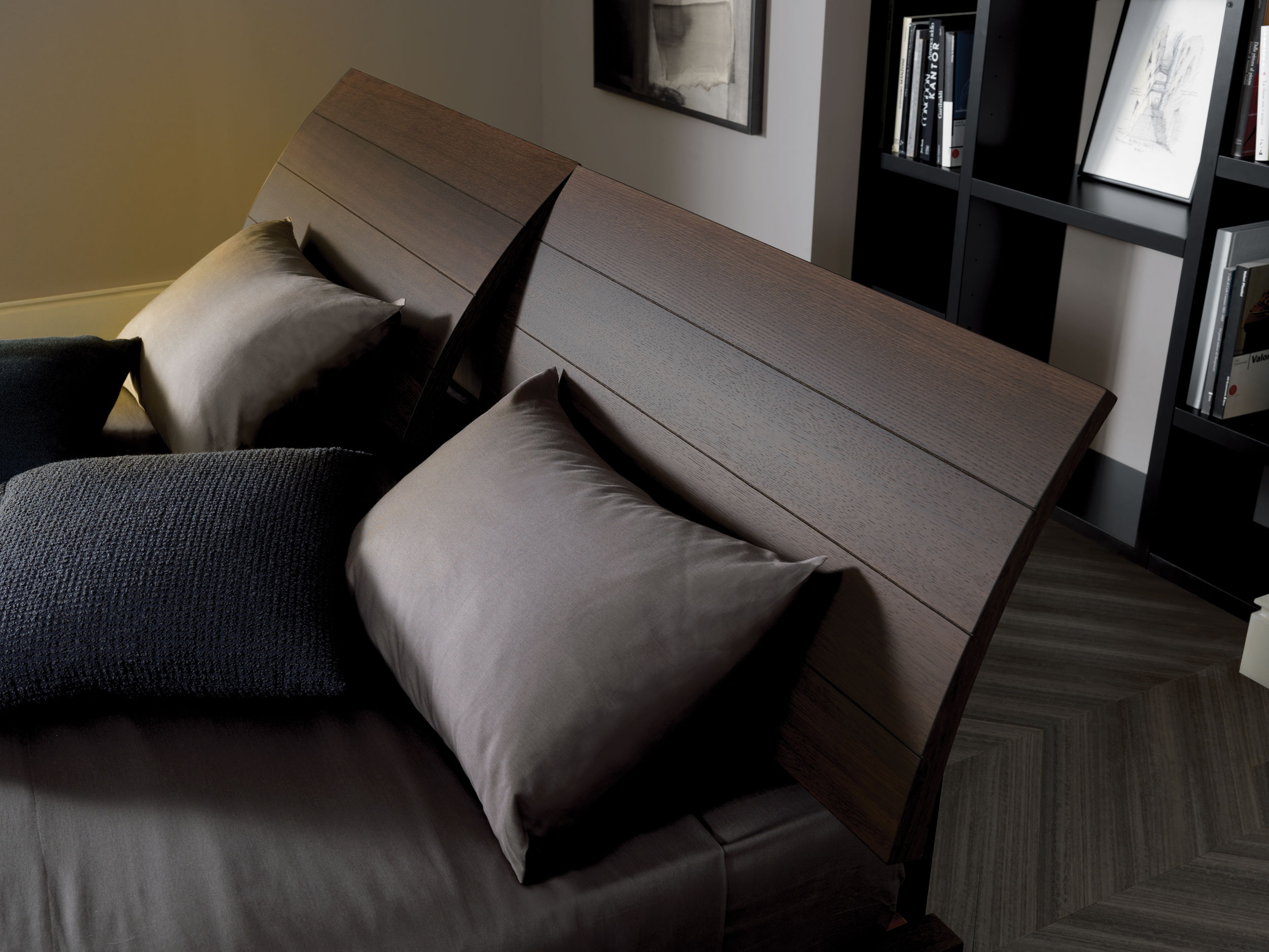 The headboard, consisting of two separate adjustable elements, creates a light curve that gives the sleeping area a delicate sign of style.