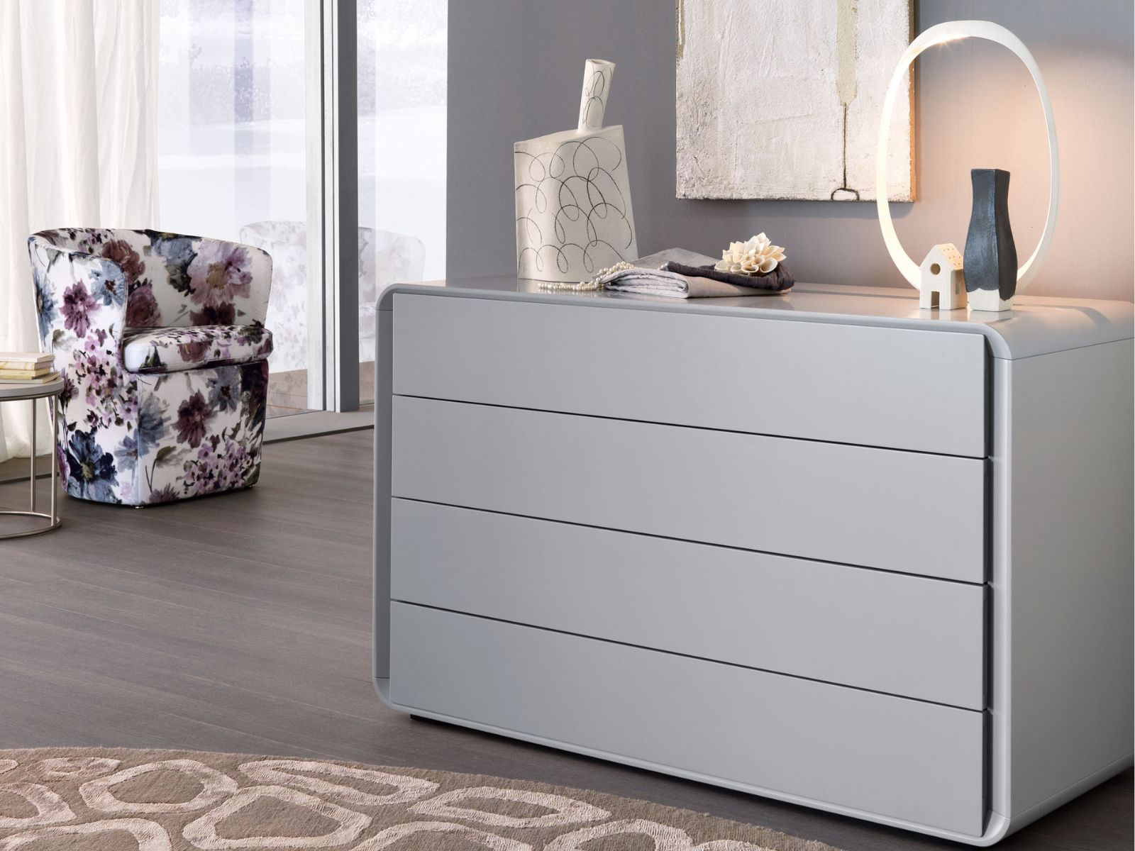 The collection Jacqueline is characterised by the refinement of the handle, which follows the entire height of the cabinet, creating, when coming together with the bevelled sides a pleasant detail.