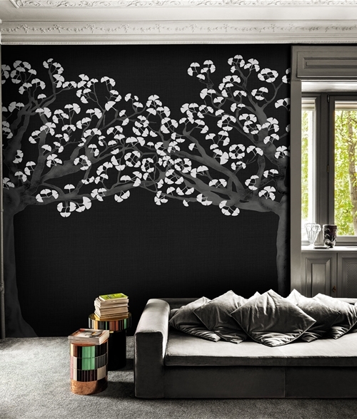 Two ginkgo trees with white leaves are reflected in this wallpaper.