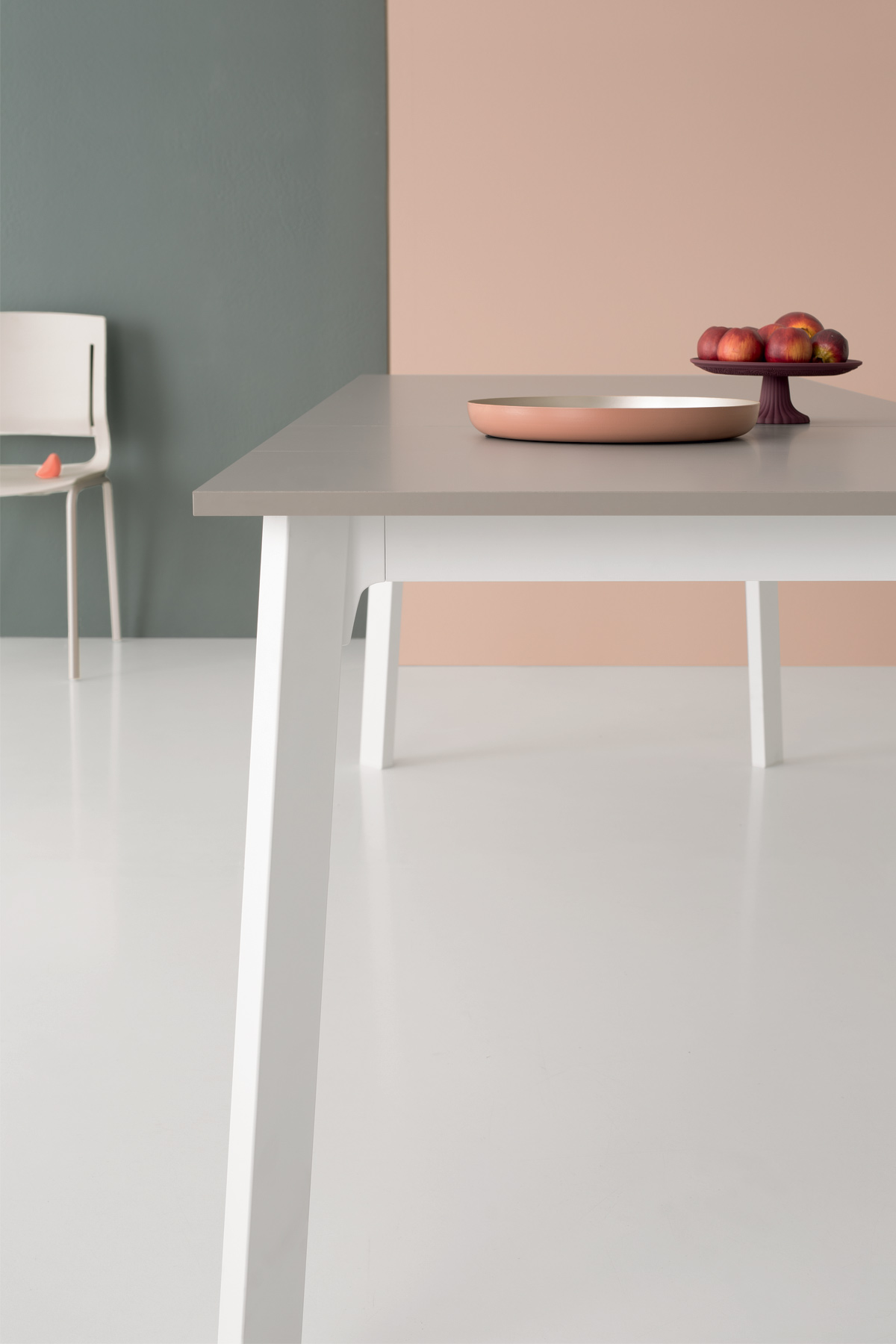 Extendable table with inox or epoxy painted metallic structure. Die-casted angular junction, inox steel or epoxy painted metallic legs, slightly inclined.