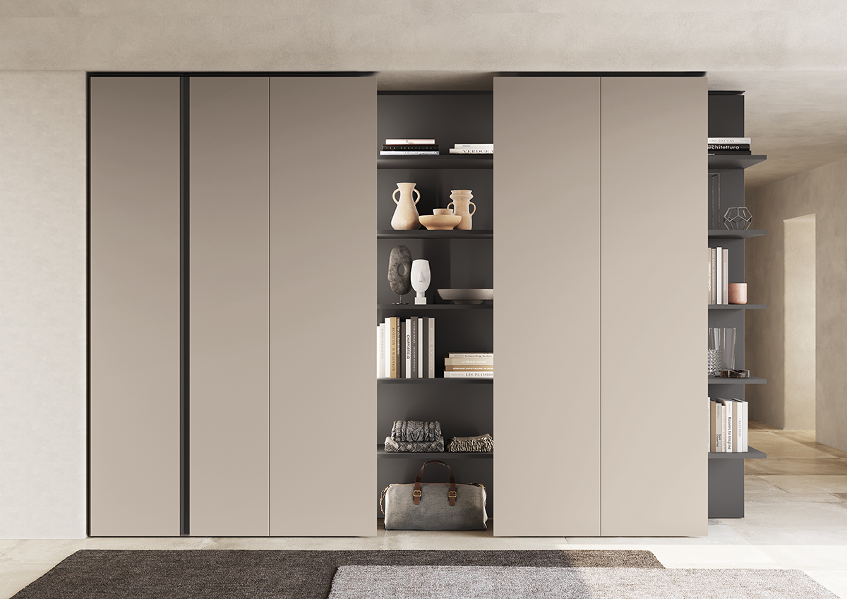 The LEWITT PLUS swing wardrobe and COVER module with integrated lighting in melamine-faced Canapa and matt lacquered Grigio fango complement each other perfectly.