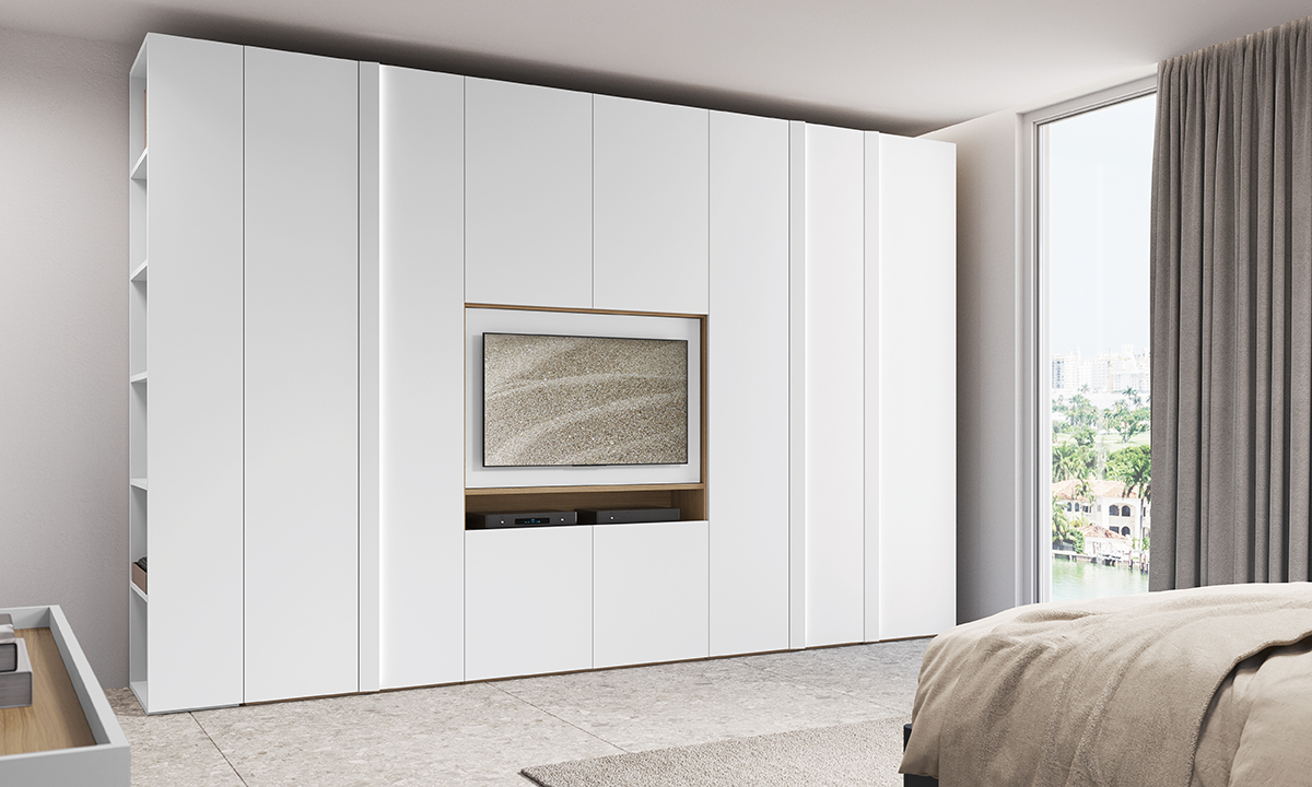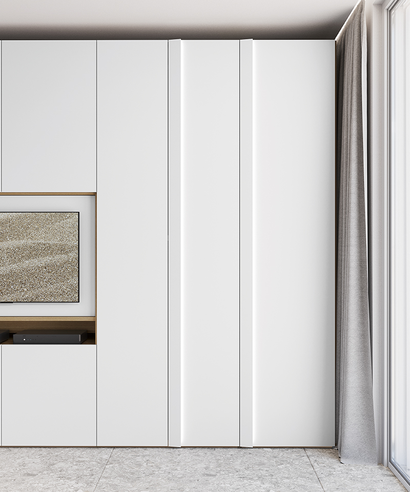 The LUMIA doors in matt lacquered Bianco neve have unique integrated lighting that complements the clean, minimalist lines.