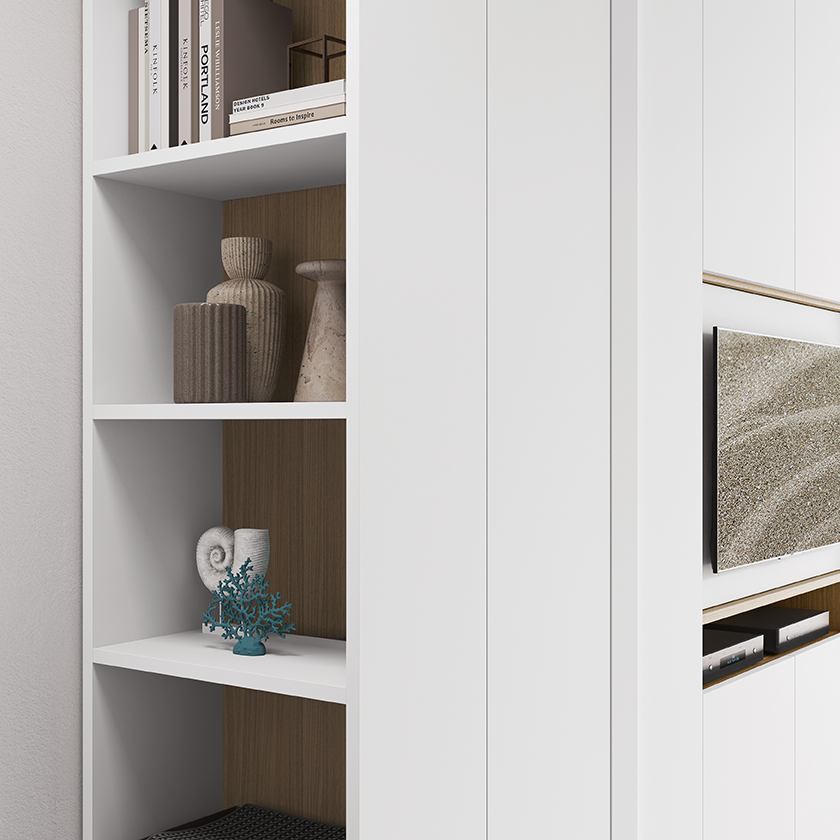 The fixed end element features a matt lacquered Bianco neve structure and contrasting back panel in melamine-faced Noce.
