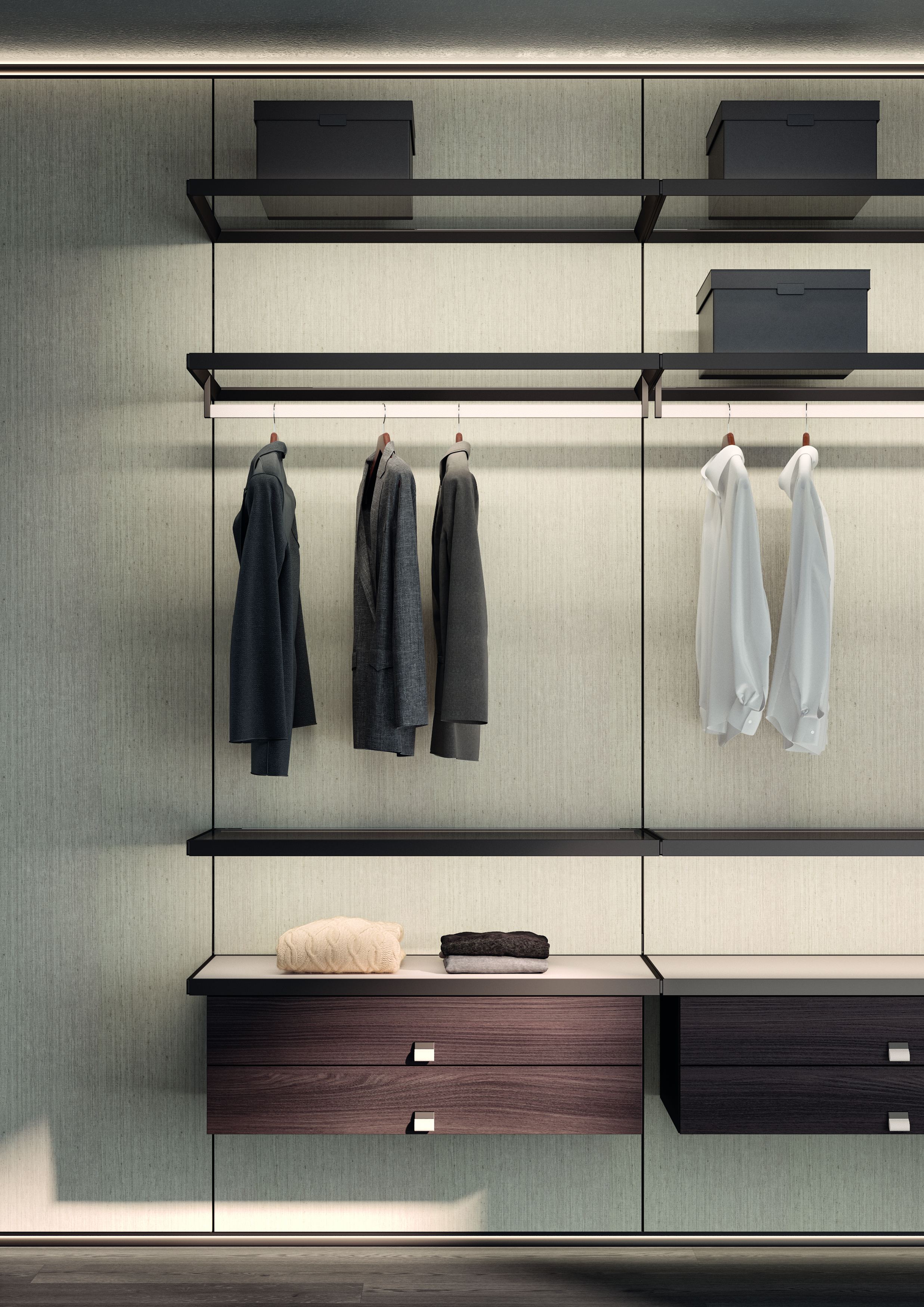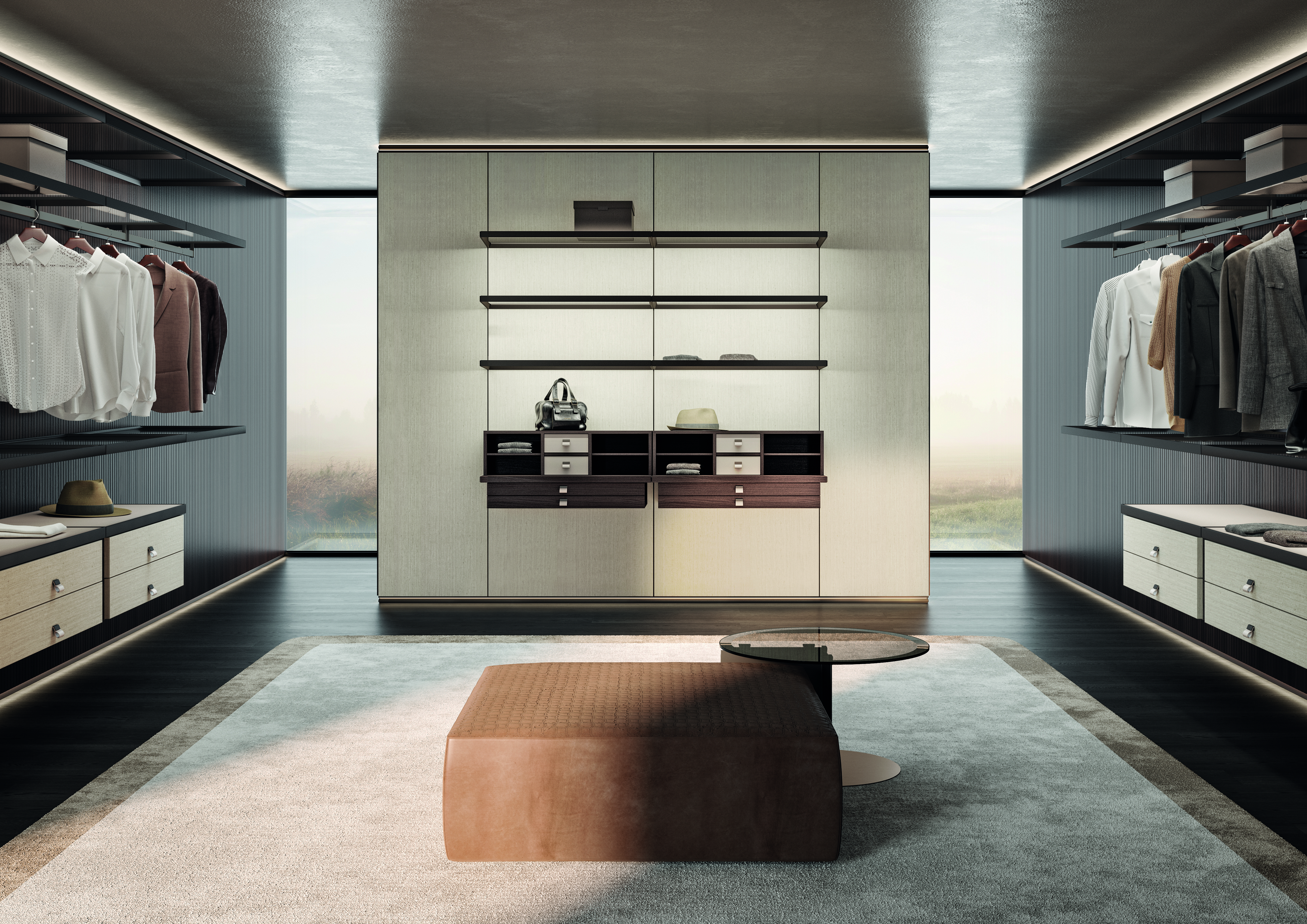 The complete integration of the supporting structure with the Palo Alto Free and Palo Alto I-Box walk-in closet systems opens up an infinite range of furnishing possibilities and allows you to create a bewitching dialogue between materials of unparalleled quality.