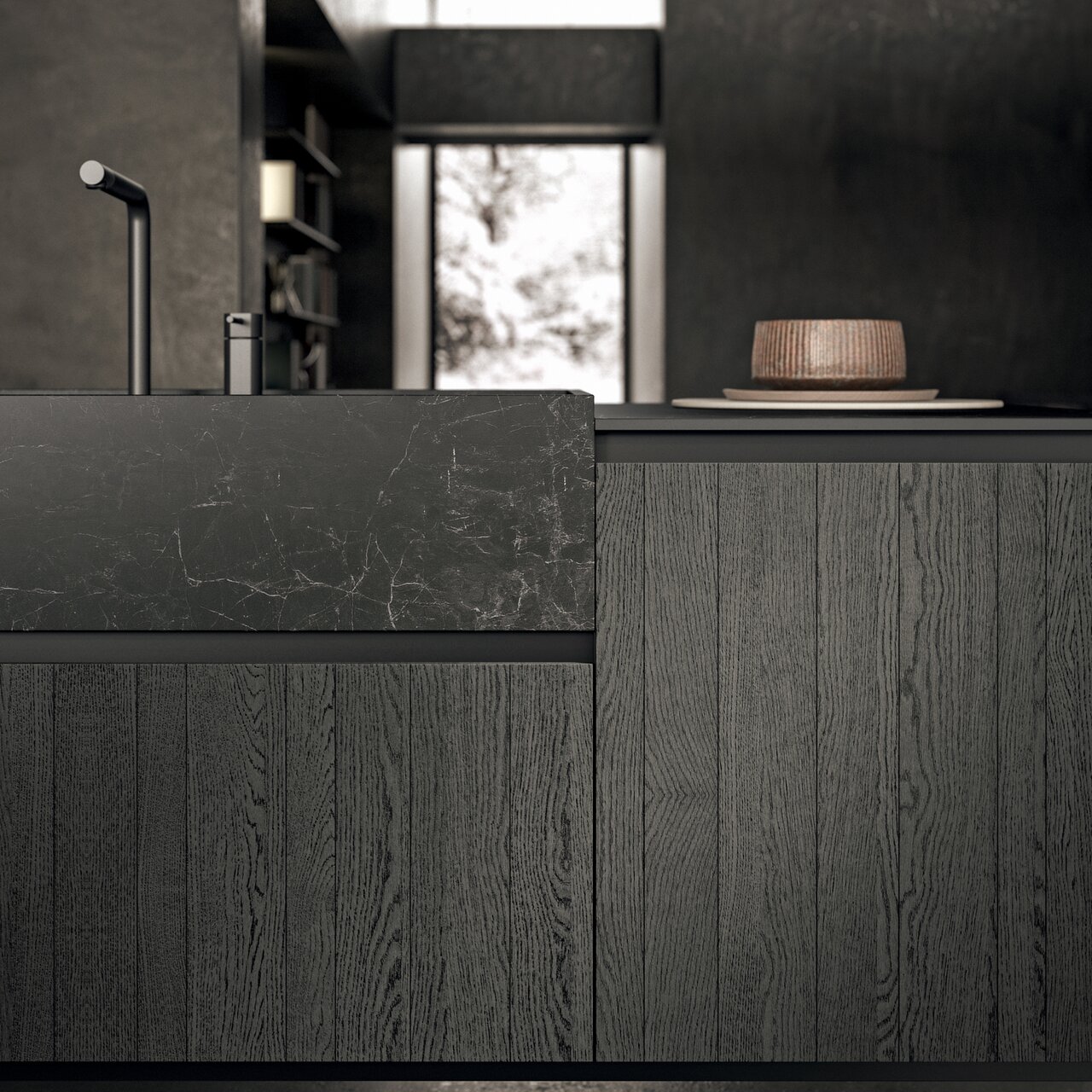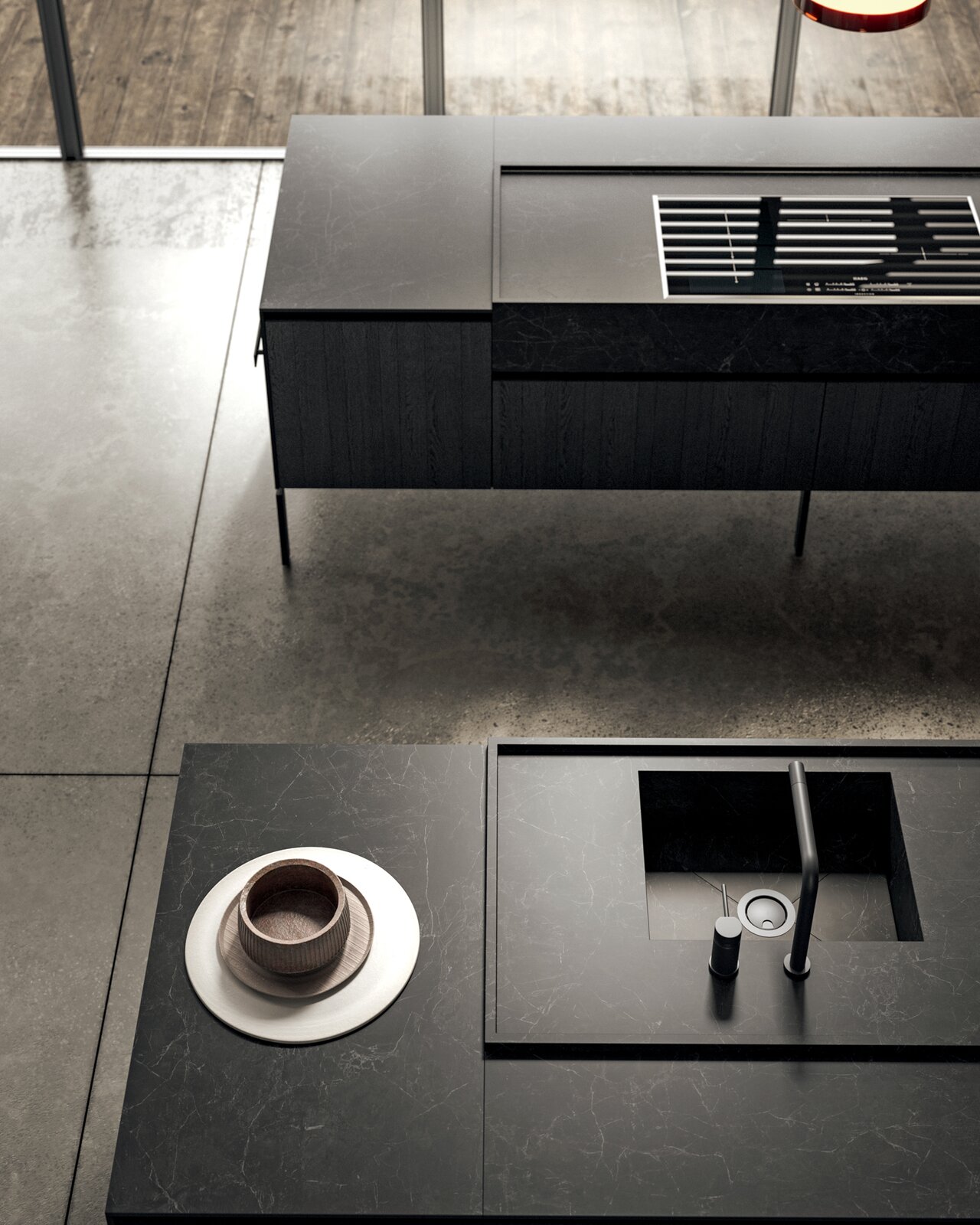Regula, born in 1998, has never ceased to grow, to this day carrying forward its concept of extreme lightness. An environment that revolves around two islands suspended on feet, both characterized by a central monoblock in Greek Black stoneware that interrupts the worktop, generating an area with an integrated stoneware sink and an area with a cooktop, respectively. They form the backdrop to a wall of Reflex glass columns illuminated with vertical LEDs and interrupted in the central part by four Jaipur Red Fenix columns containing ovens and refrigerator.