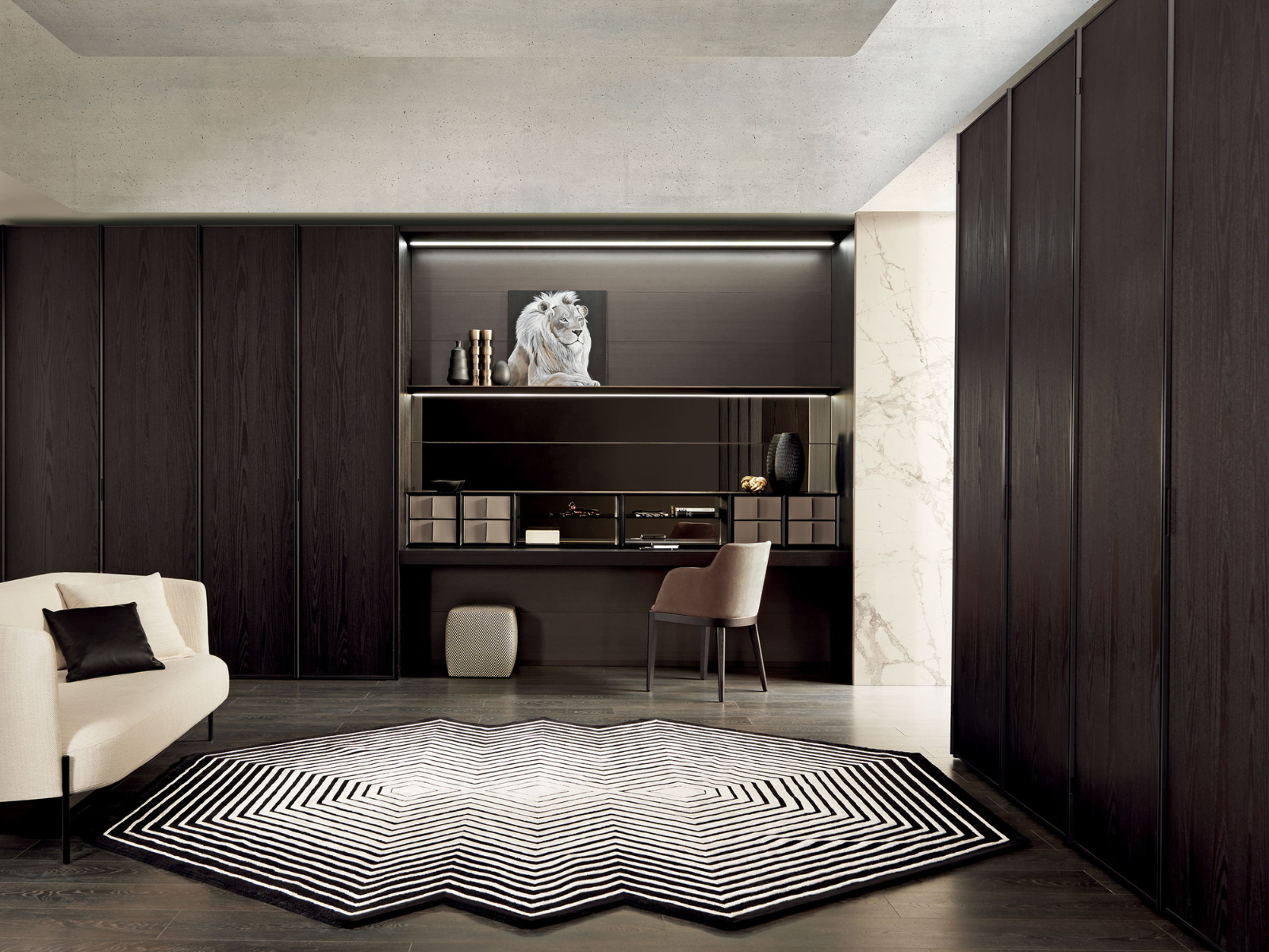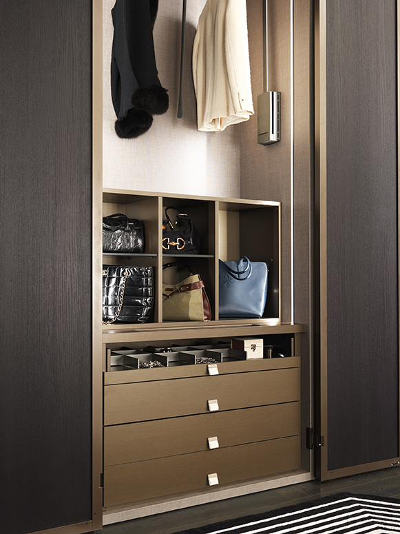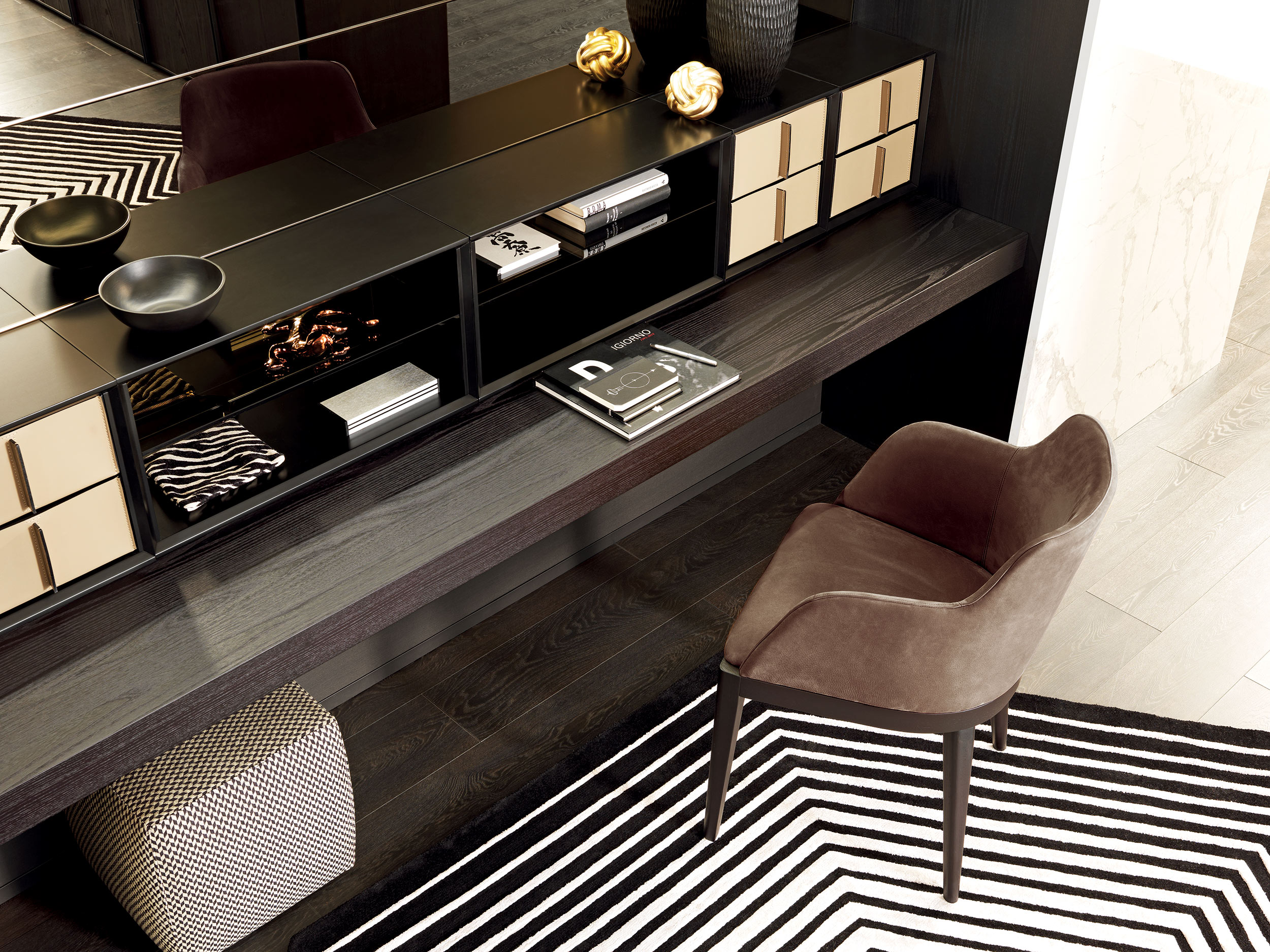 The refined metallic accents of the frame define and illuminate the bedroom, creating harmonious material contrasts in the versions combined with wood.