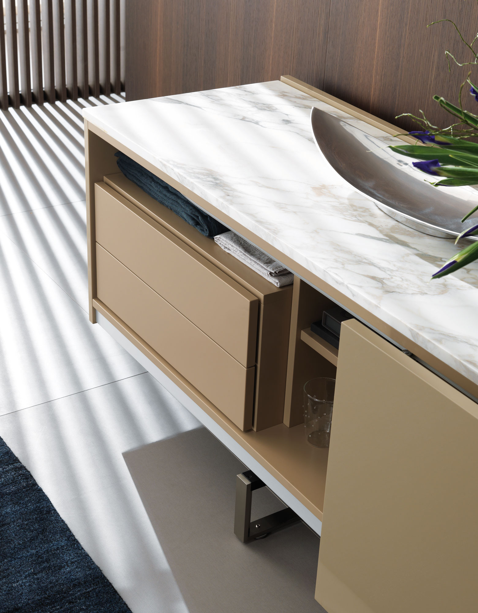 Structure: Eucalyptus laminate.Double-faced drawer unit for the center of the room.