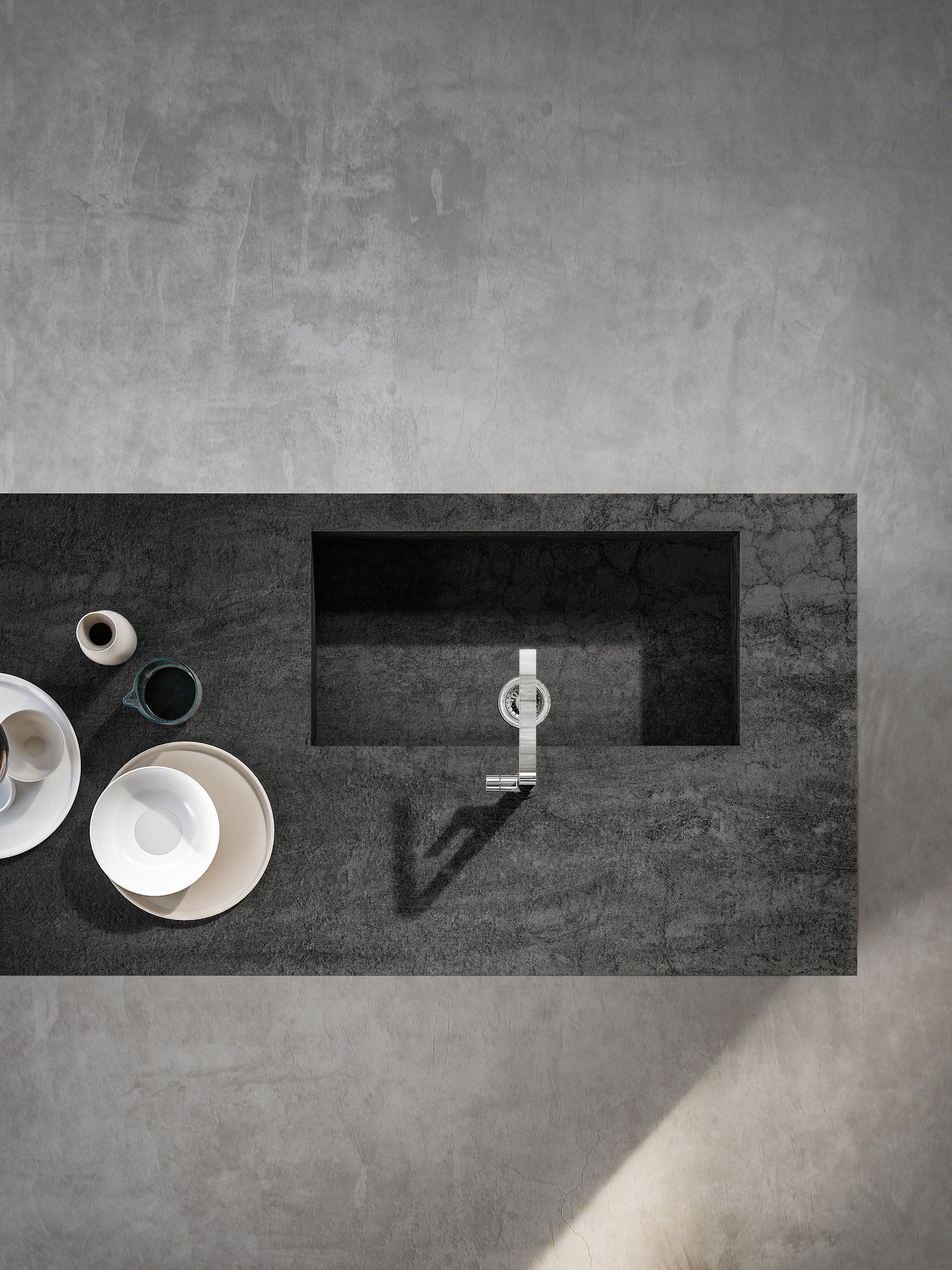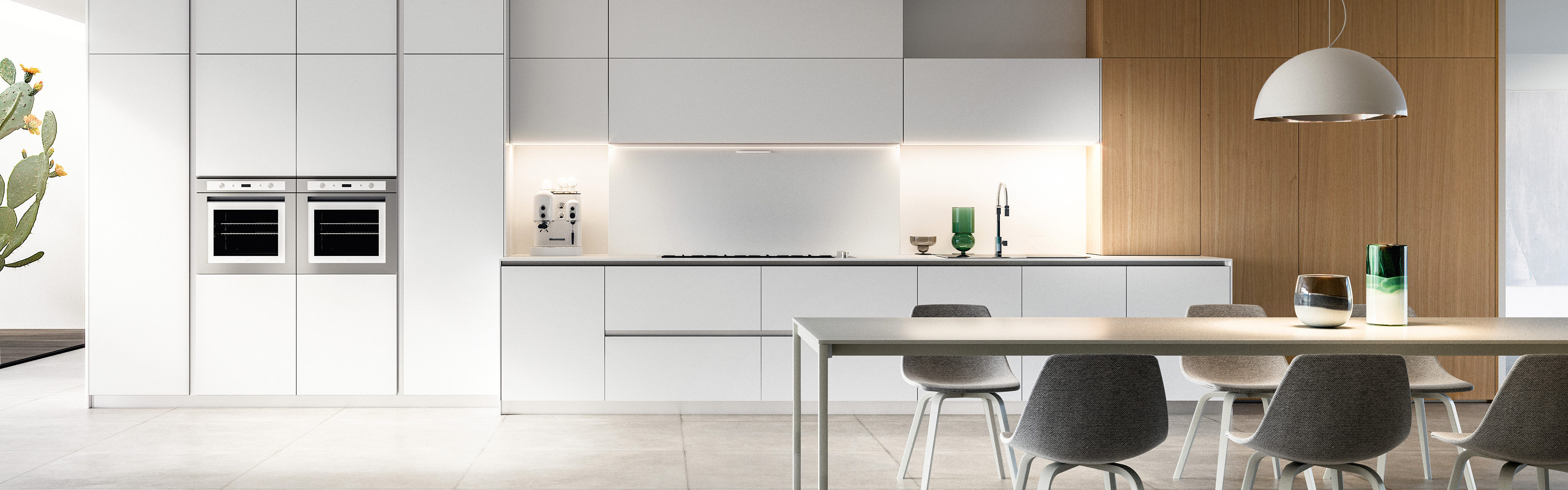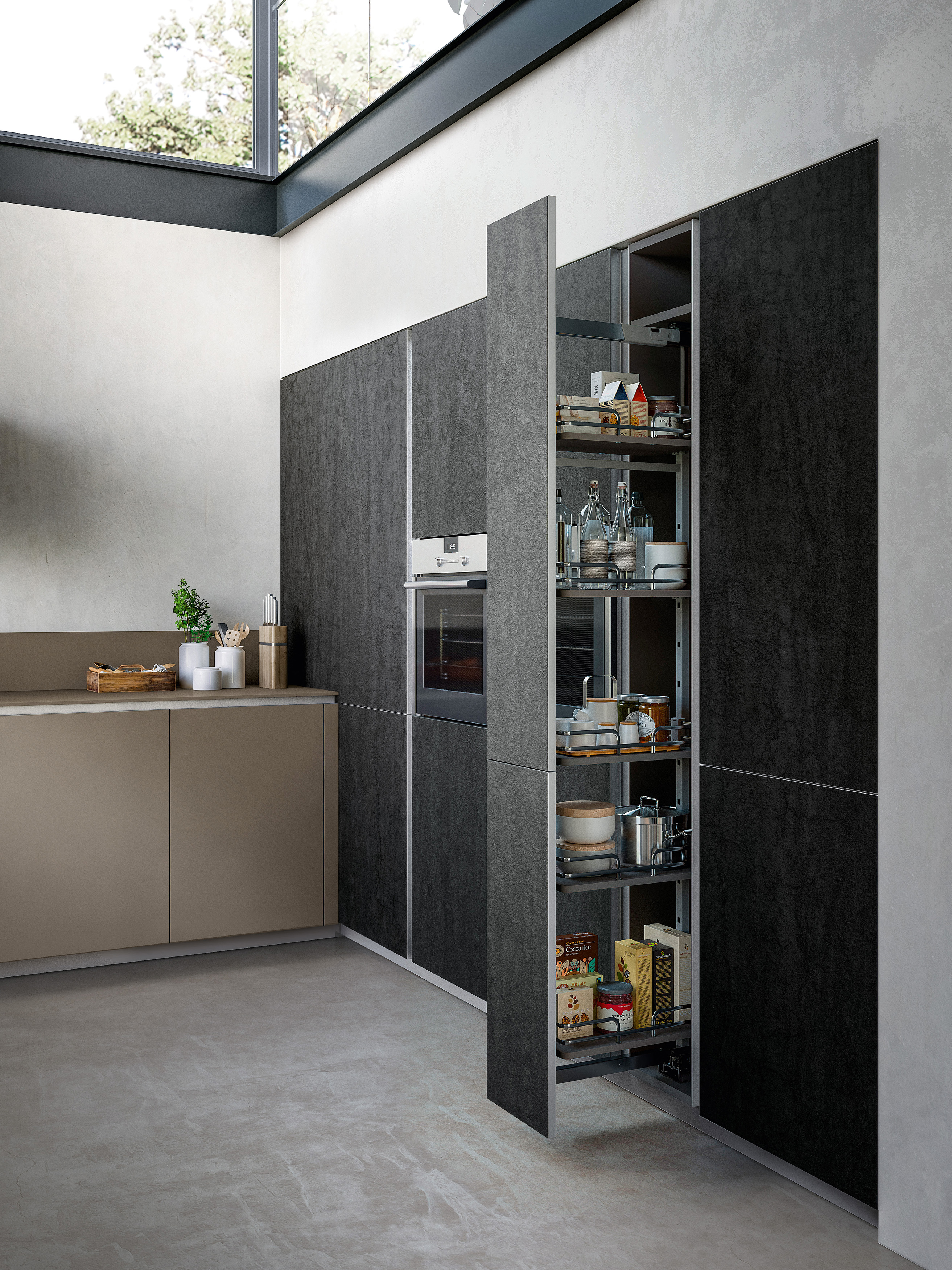 A kitchen that interprets modernity, combining the elegance of innovative materials with the technology of the cabinet doors with aluminium frames. The resulting spaces are functional, beautiful and enhanced by elegant reflections from the glass and the rich texture of materials such as Laminam, also available for worktops.
