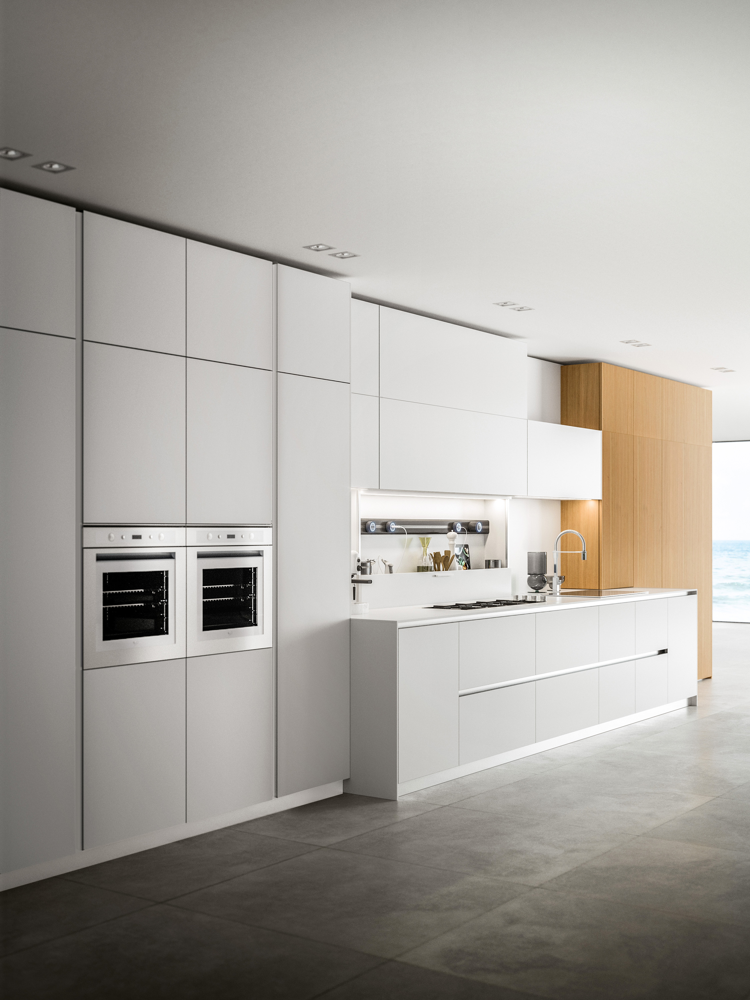 The cabinet door of the T16 kitchen is one of a kind, combining different materials within a single element and offering a choice of stylish door fronts, including in tempered glass with a glossy and matt finish in six different colours and stoneware in six more varieties of materials.
