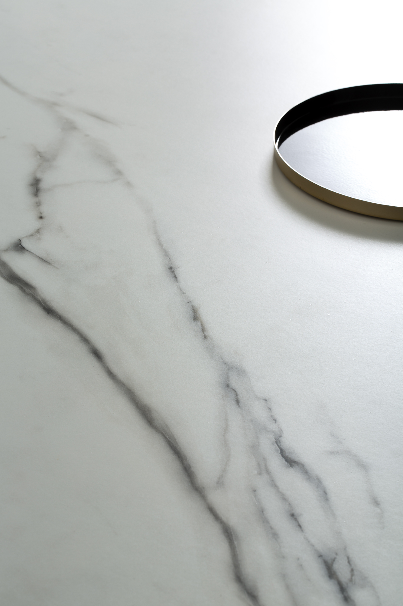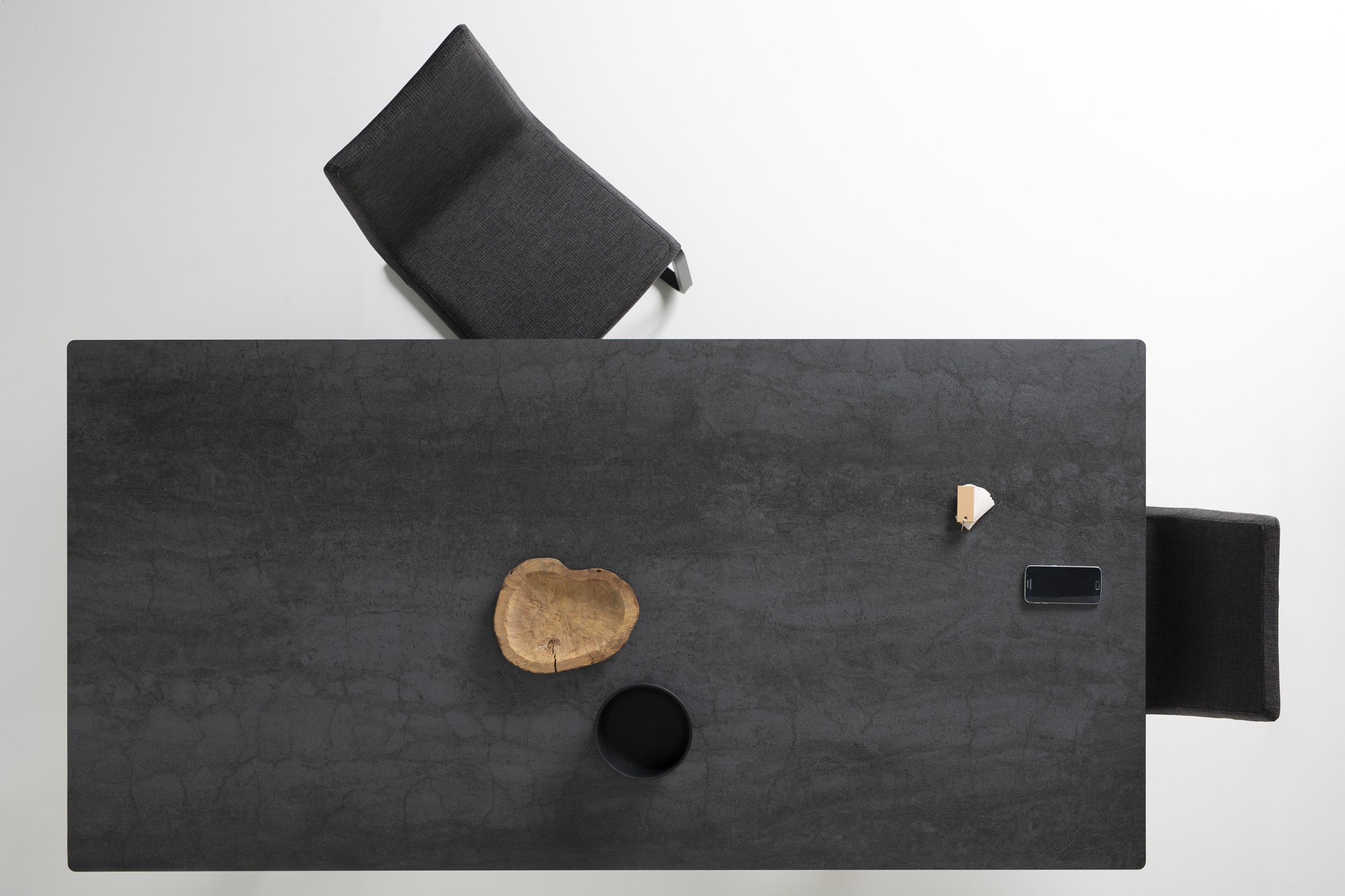 The 40mm-thick top is available in knotty oak veneer, solid wood with trunk-effect shaping, or in stoneware laminated to glass with 18mm thickness.
