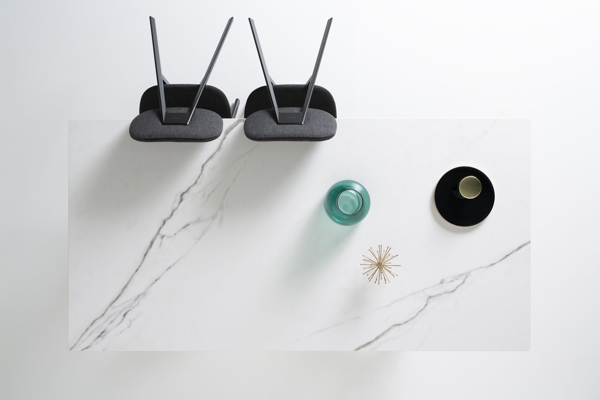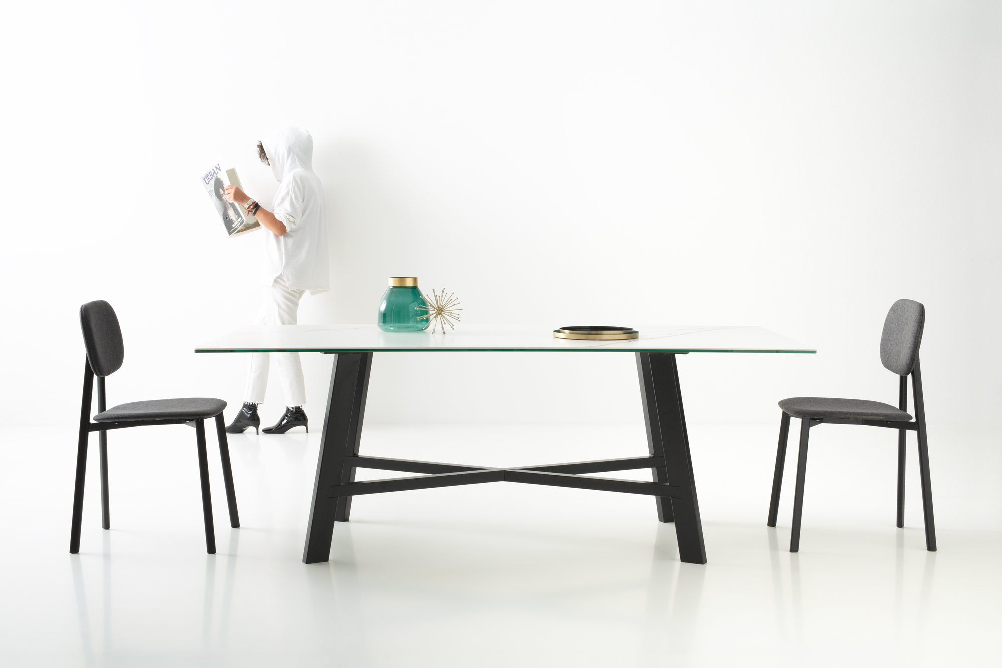 Central base made of epoxy powder coated tubular metal. Special feature of the base is the visible joints made by laser cutting technology.