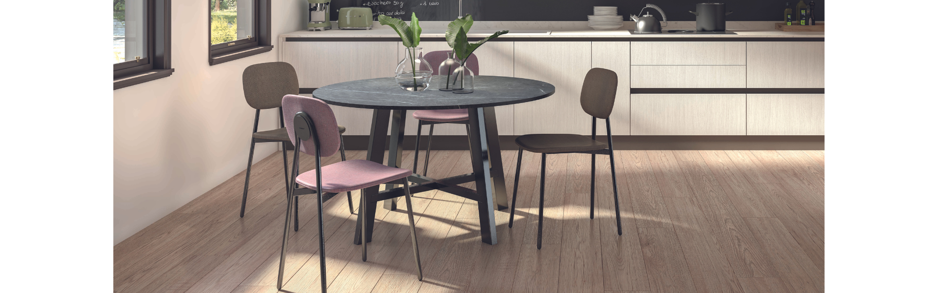 Central tubular metal base combined with an 18mm thick Cleaf laminate top.