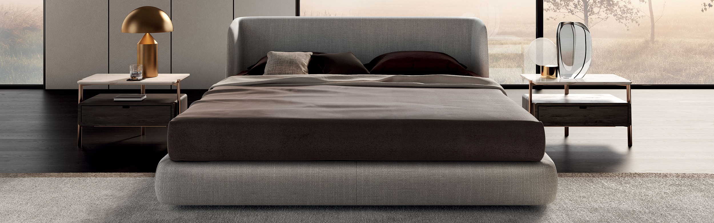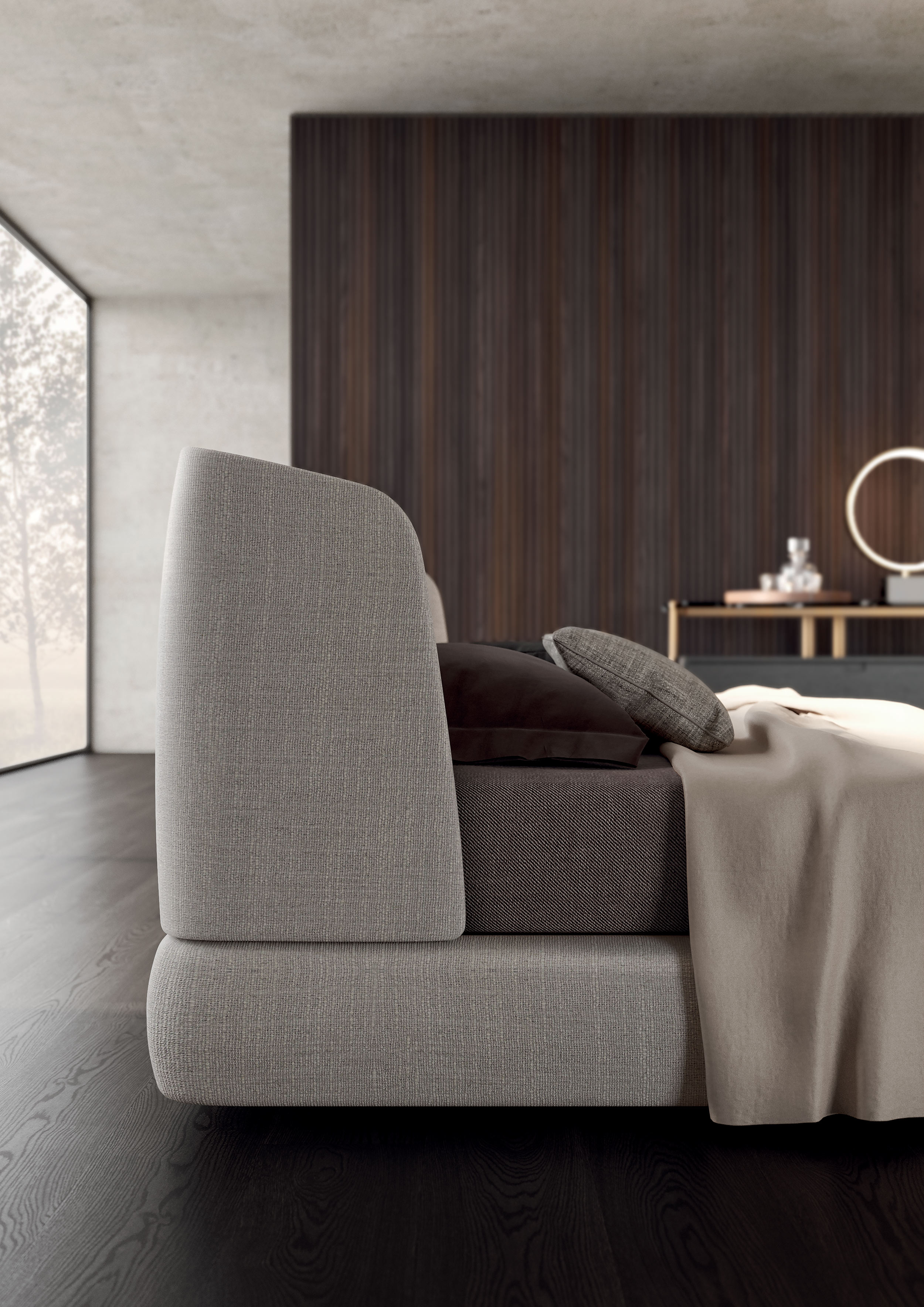 Bed with an elegant sculptural shape, essential and welcoming, an expression of MisuraEmme's sartorial vocation, able to combine softness and rationality.